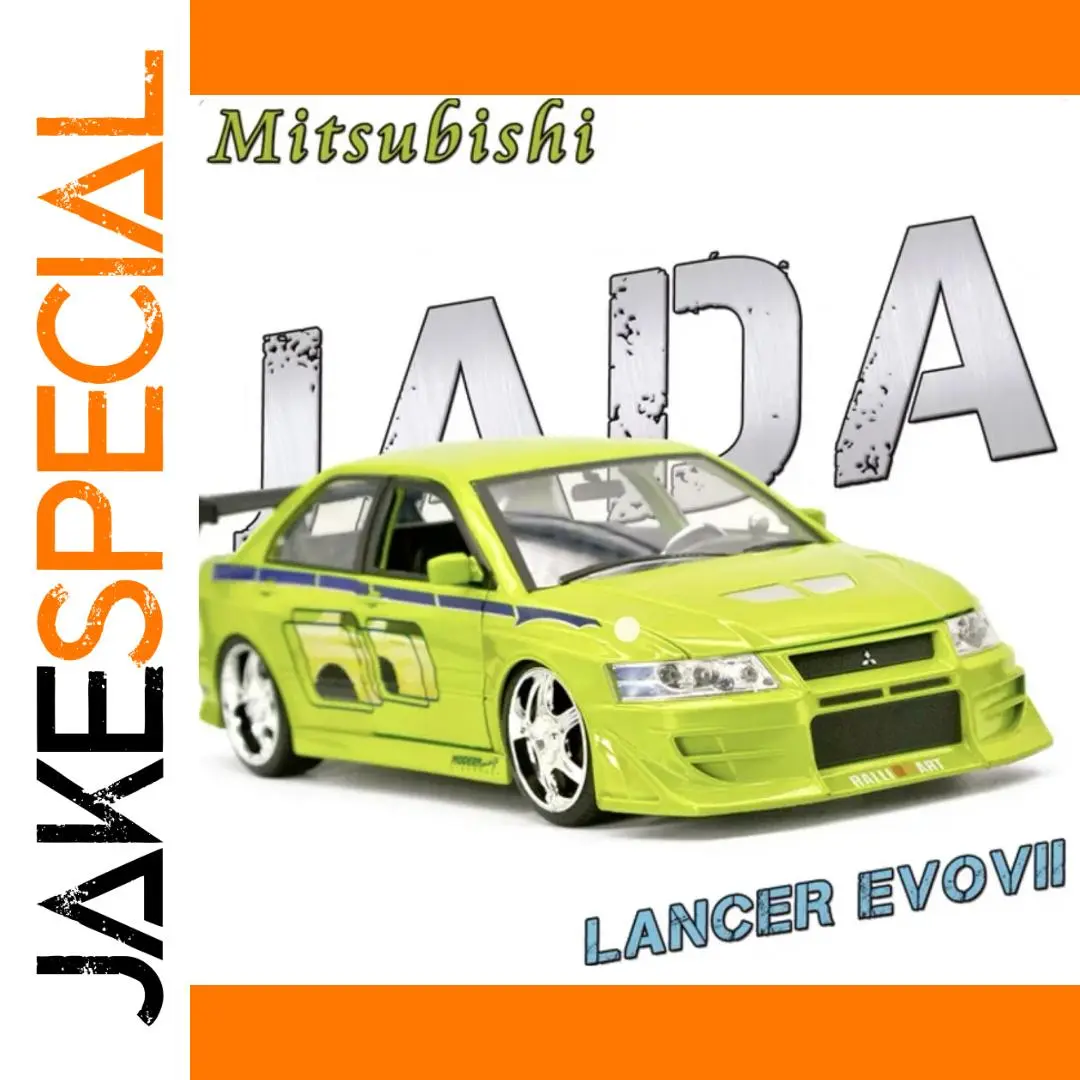 Experience the dynamic appeal of this 1:24 scale diecast metal miniature car, meticulously crafted to represent the Mitsubishi Lancer Evolution VII in vibrant, glossy green. Made from alloy and plastic, this detailed model features aerodynamic lines, a prominent front bumper with large air intakes, quad headlamps covered with clear plastic, and chrome-finished multi-spoke wheels with textured black rubber tires. Its sporty design is accentuated by a horizontal blue and yellow stripe decal along the sides, making it a perfect addition for collectors and enthusiasts. Suitable for ages 4 and up, this model combines durability, precision, and realism, offering a striking display piece or a fun toy.