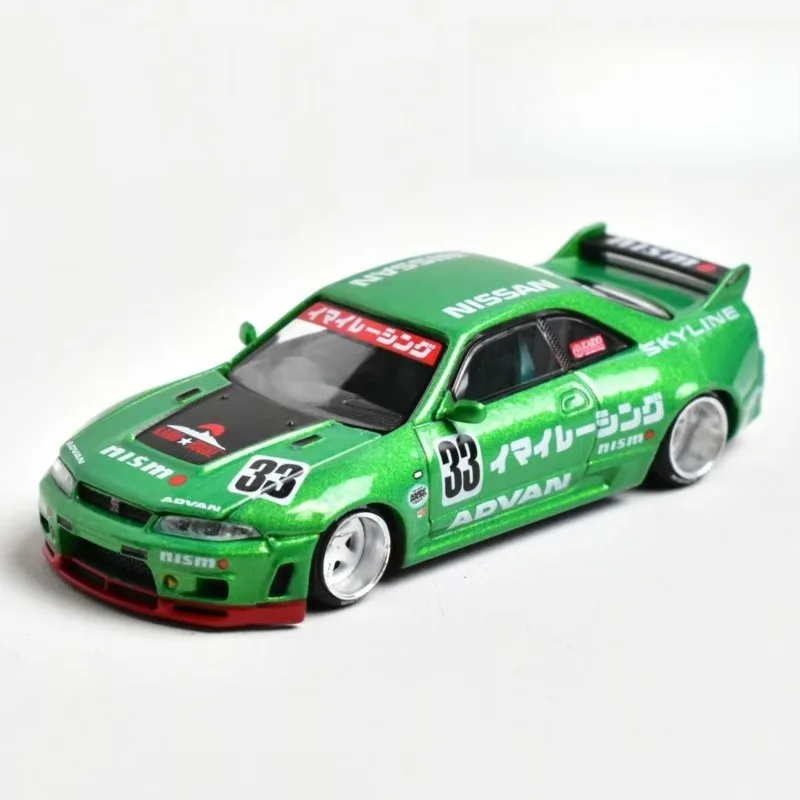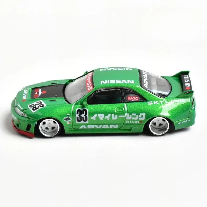 - The model features a vibrant R33 green paint scheme, complemented by black accents and bold red details around the front intake, capturing the distinct style of the classic Nissan Skyline GTR R33.