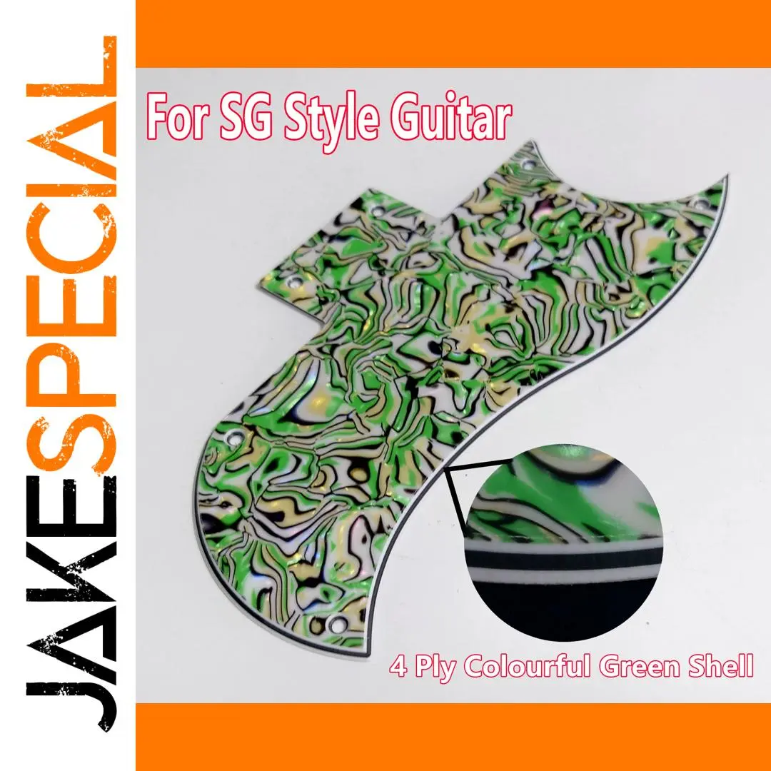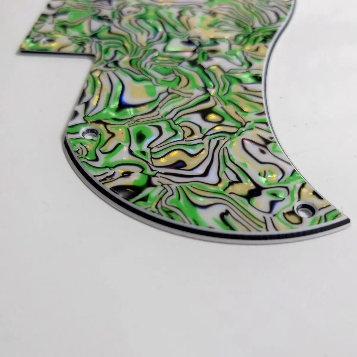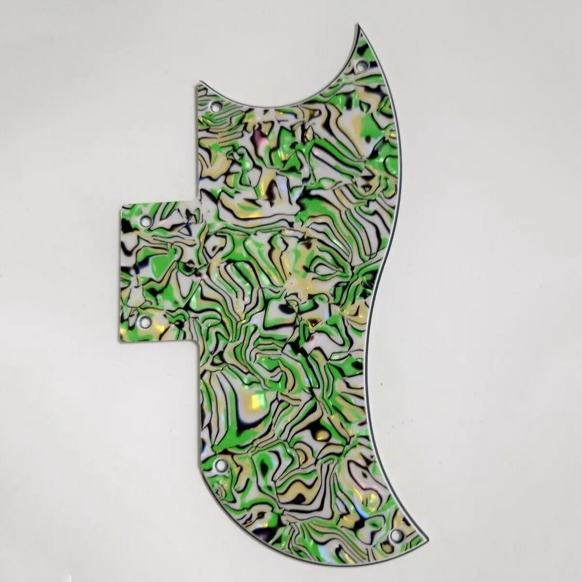 Transform your guitar’s appearance with this colorful, high-quality pickguard designed specifically for SG-style guitars. Crafted from durable, four-ply plastic, it offers a striking multicolored swirling pattern featuring shades of green, black, white, and subtle hints of gold or beige. Its glossy finish enhances the layered, marbled visual effect, making your instrument stand out on stage or in your collection. The pickguard’s unique asymmetrical shape comfortably contours around pickups, with five precisely drilled mounting holes for easy installation. This replacement part combines aesthetic appeal with long-lasting resistance to breakage, ensuring it remains vibrant over time. Elevate your guitar's style with this artistic, protective accessory that’s both functional and eye-catching.
