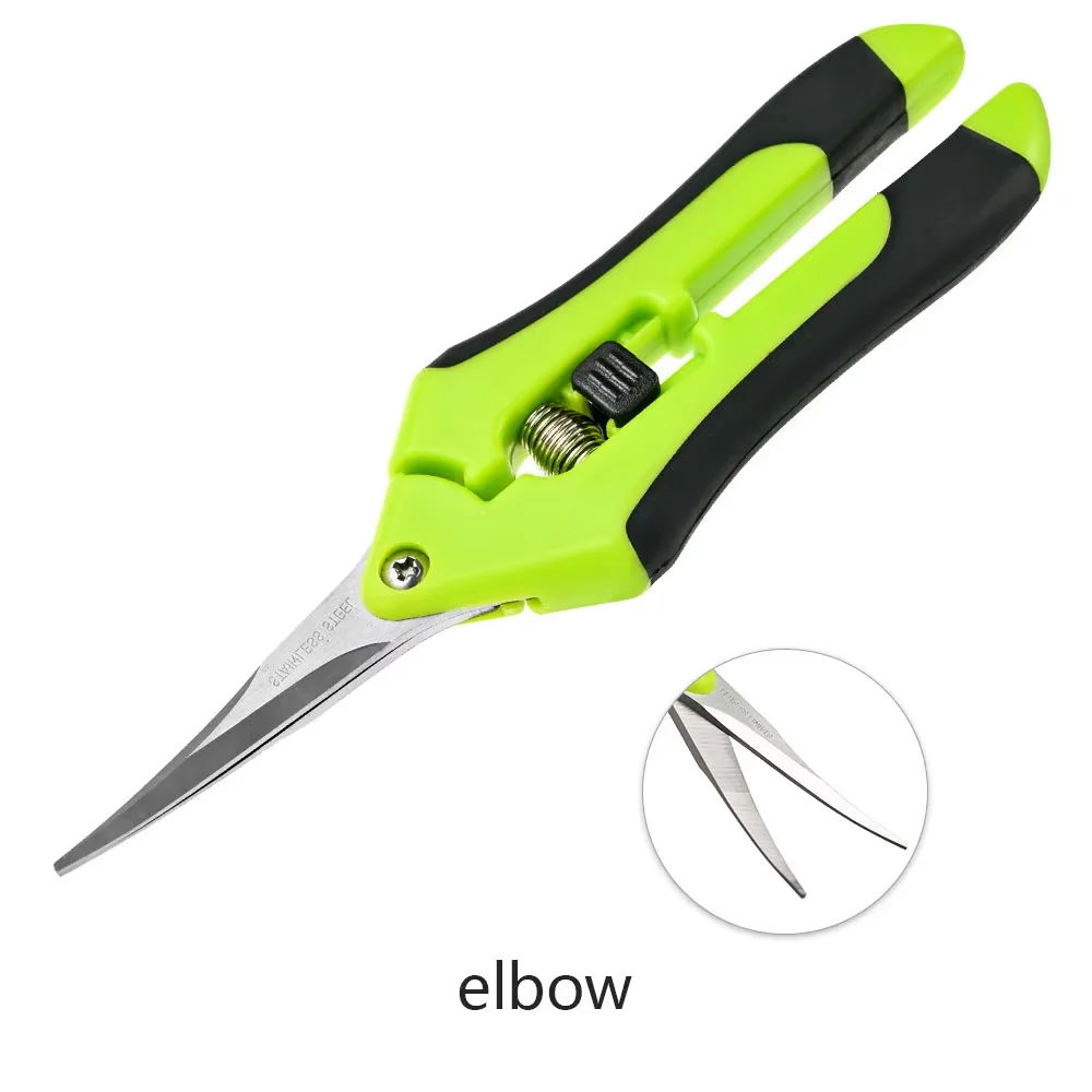Imagine having these efficient gardening scissors in your hand, ready to tackle your planting tasks with ease. With a length of 6.5″, these scissors feature straight, narrow stainless steel blades marked with “STAINLESS STEEL,” ensuring durability and precision. The ergonomic handle, primarily in bright green with black rubber or silicone grips, offers maximum comfort and control during use. The spring mechanism allows for effortless opening and closing, making trimming and pruning less tiring. A black plastic locking mechanism secures the blades when idle, enhancing safety. Whether you're trimming grapevines or working on small woodworking projects, this tool combines functionality with vibrant style, making your gardening experience more enjoyable and effective.