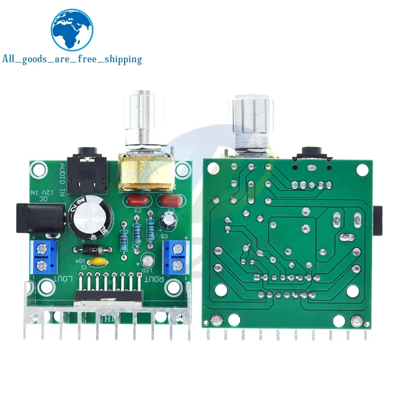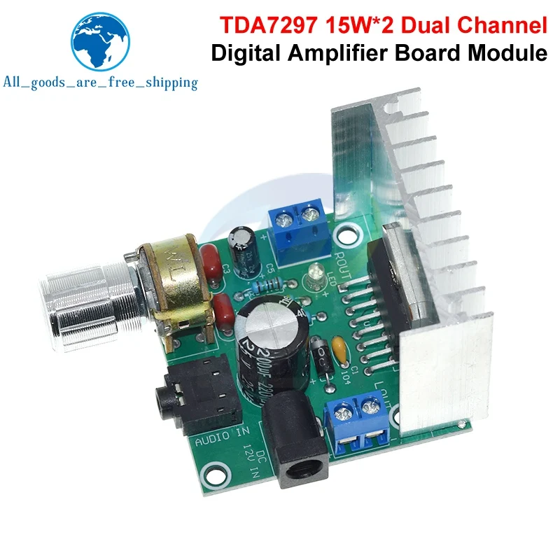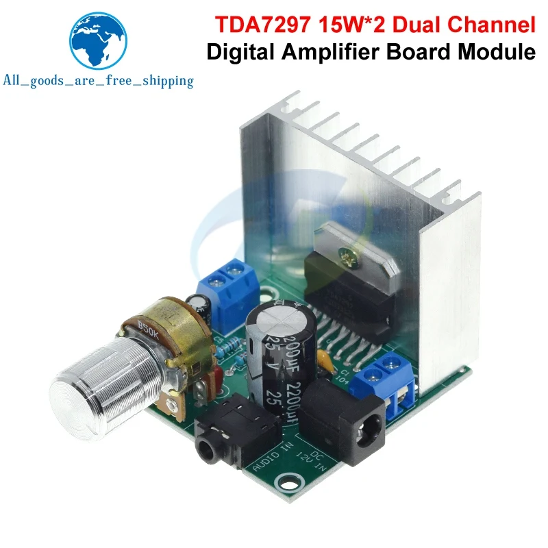 This dual-channel audio amplifier module features a TDA7297 chip capable of delivering 15W per channel for a total of 30W output. Its vibrant green PCB is equipped with a large black cylindrical capacitor with a silver top, a silver finned heat sink for efficient heat dissipation, and colorful components like an orange capacitor and a yellow element, creating a striking industrial look. The module includes a metallic knurled volume knob for precise control and a blue terminal block for easy connections. Suitable for DIY electronic projects, it operates across a temperature range of -40°C to +85°C and is ideal for use with switches, sensors, computer systems, and other electronic devices, offering reliable performance and versatility.
