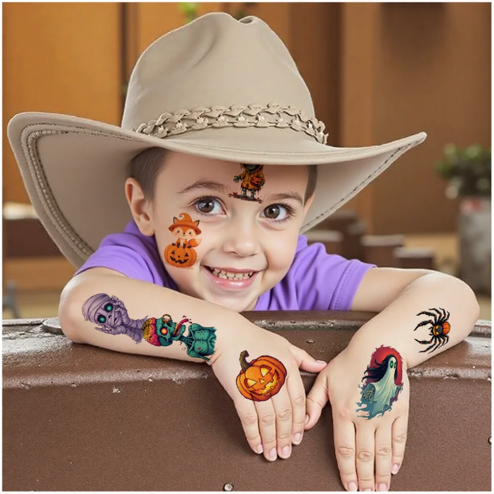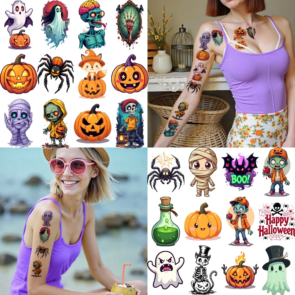 Imagine adding a splash of spooky fun to your look with this collection of 54 vibrant Halloween-themed temporary tattoos. Perfect for both adults and teens, these waterproof stickers feature colorful pumpkin faces, mischievous ghosts, spooky skeletons, and whimsical spiders. With styles ranging from realistic to cartoon and watercolor, they bring playful yet eerie vibes to any occasion. Whether you're decorating your arms, legs, or body, they effortlessly enhance your Halloween costume or party outfit. Easy to apply within 30 seconds and lasting 3-7 days, these tattoos let you express your festive spirit with ease and style. Reusable and non-toxic, they’re ideal for all seasons, making every event more fun and memorable.