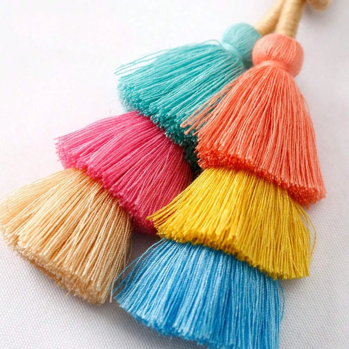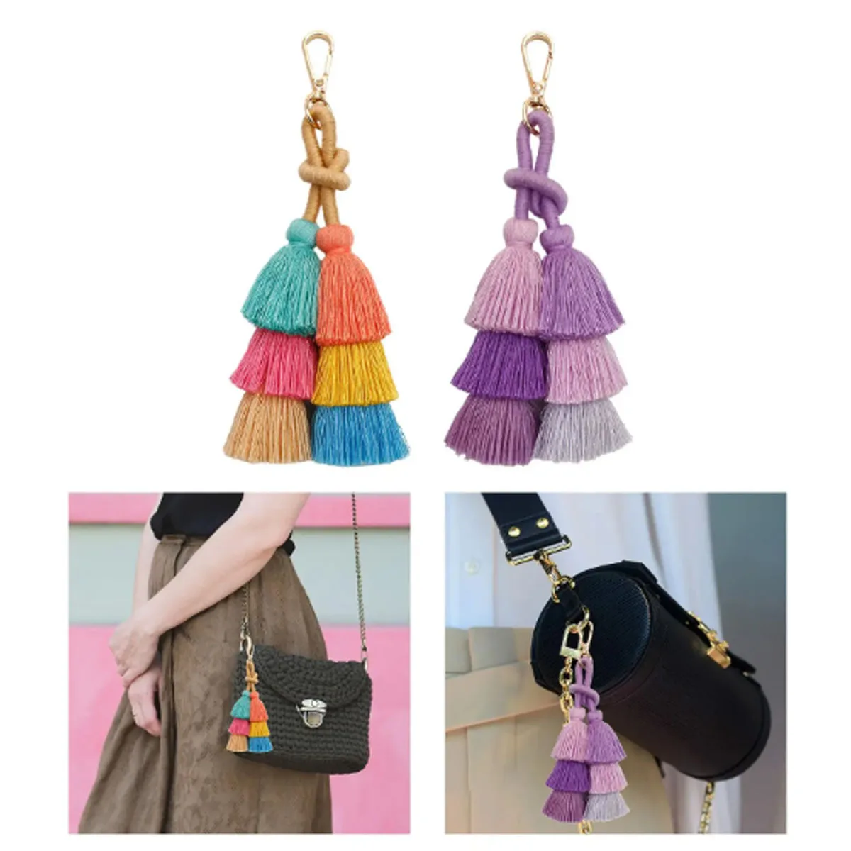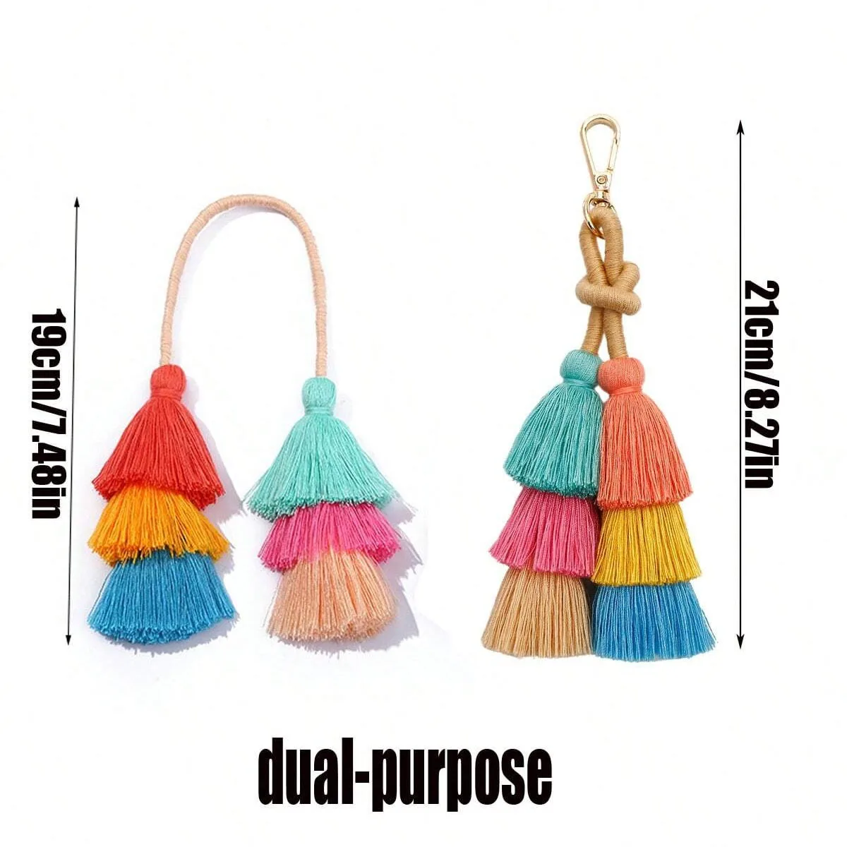 Add a vibrant touch to your accessories with this handmade multicolor layered tassel keychain, featuring five soft, fringed tassels in shades of light pink, yellow, coral orange, teal, and light blue, arranged in a fan-like, full-bodied design. Made from durable plastic with a gold-colored metal lobster clasp accented by imitation rhodium, it offers a trendy, playful aesthetic suitable for casual and sporty styles. The square-shaped keychain measures enough for handbag or key attachment, making it an ideal gift or decorative accent. Unisex and compatible with all items, this lively accessory embodies a layered, textured look that will surely catch the eye.
