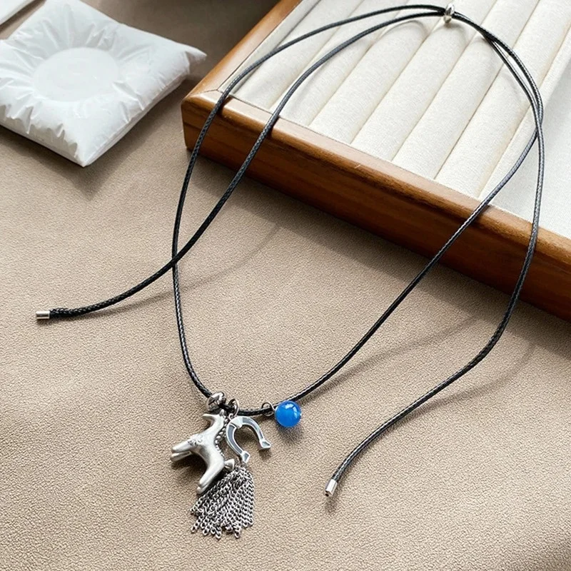 - Features a distinctive horse-shaped pendant crafted in punk fashion with animal-shaped pattern details.