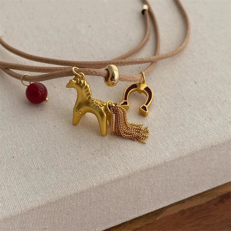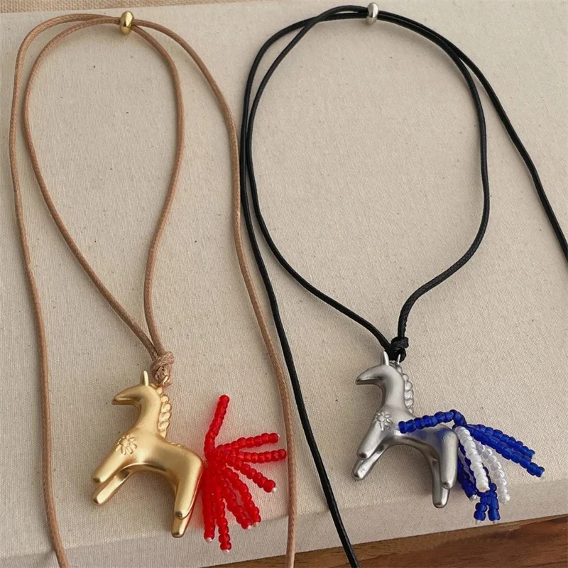 Share your unique style with this striking horse-shaped pendant necklace that combines playful animal design with punk fashion elements. Crafted from durable zinc alloy, the pendant features diverse colors, including metallic silver, polished gold, textured red bead, and white with contrasting blue details. The adjustable long wax rope chain offers flexibility for various looks, from casual to bold. Whether you're celebrating a birthday or simply expressing your individual style, this necklace is an eye-catching accessory. Its eclectic mix of textures, colors, and animal motifs makes it perfect for women seeking a stand-out piece. Lightweight yet durable, it adds a spirited touch to any outfit, enhancing your confidence and sense of fashion.