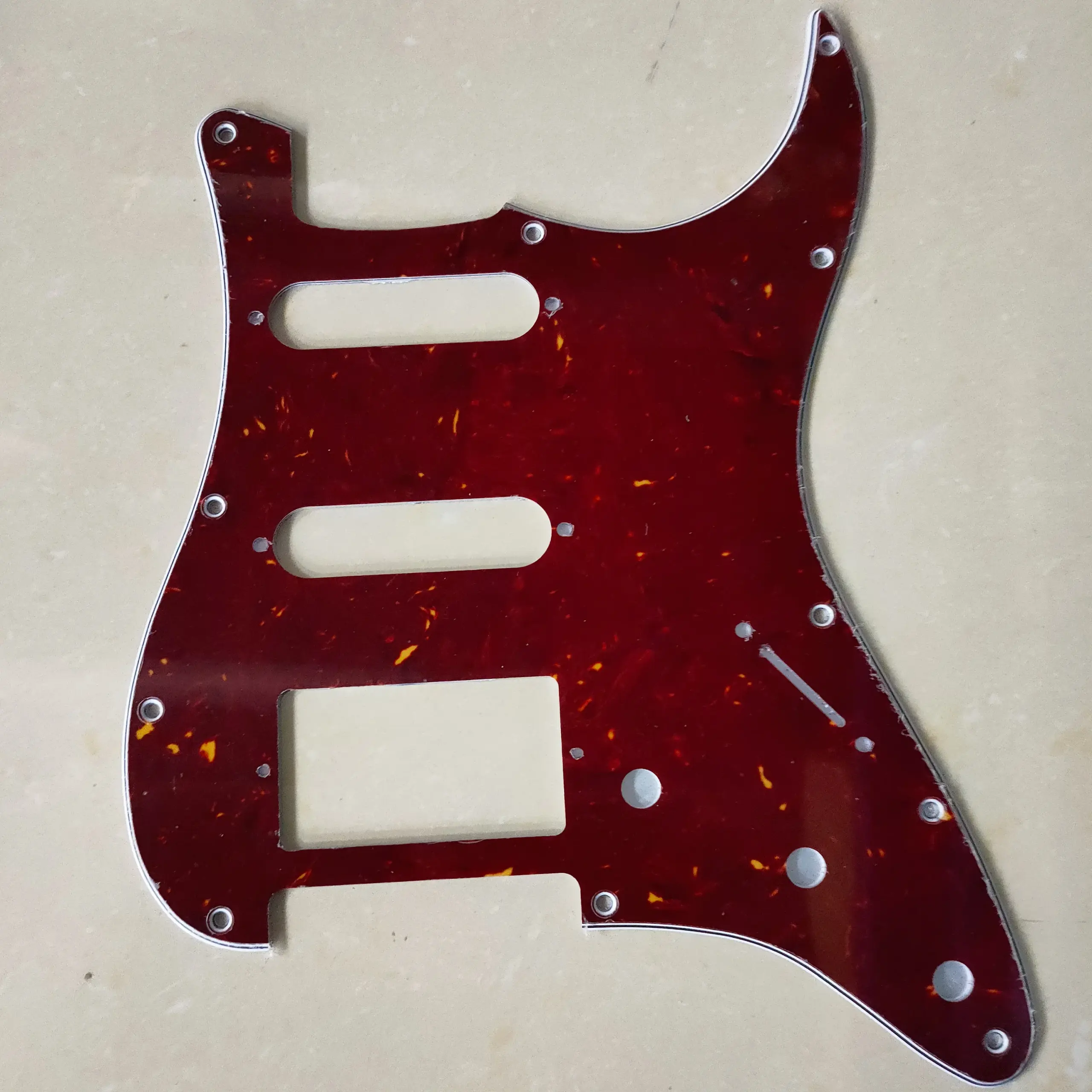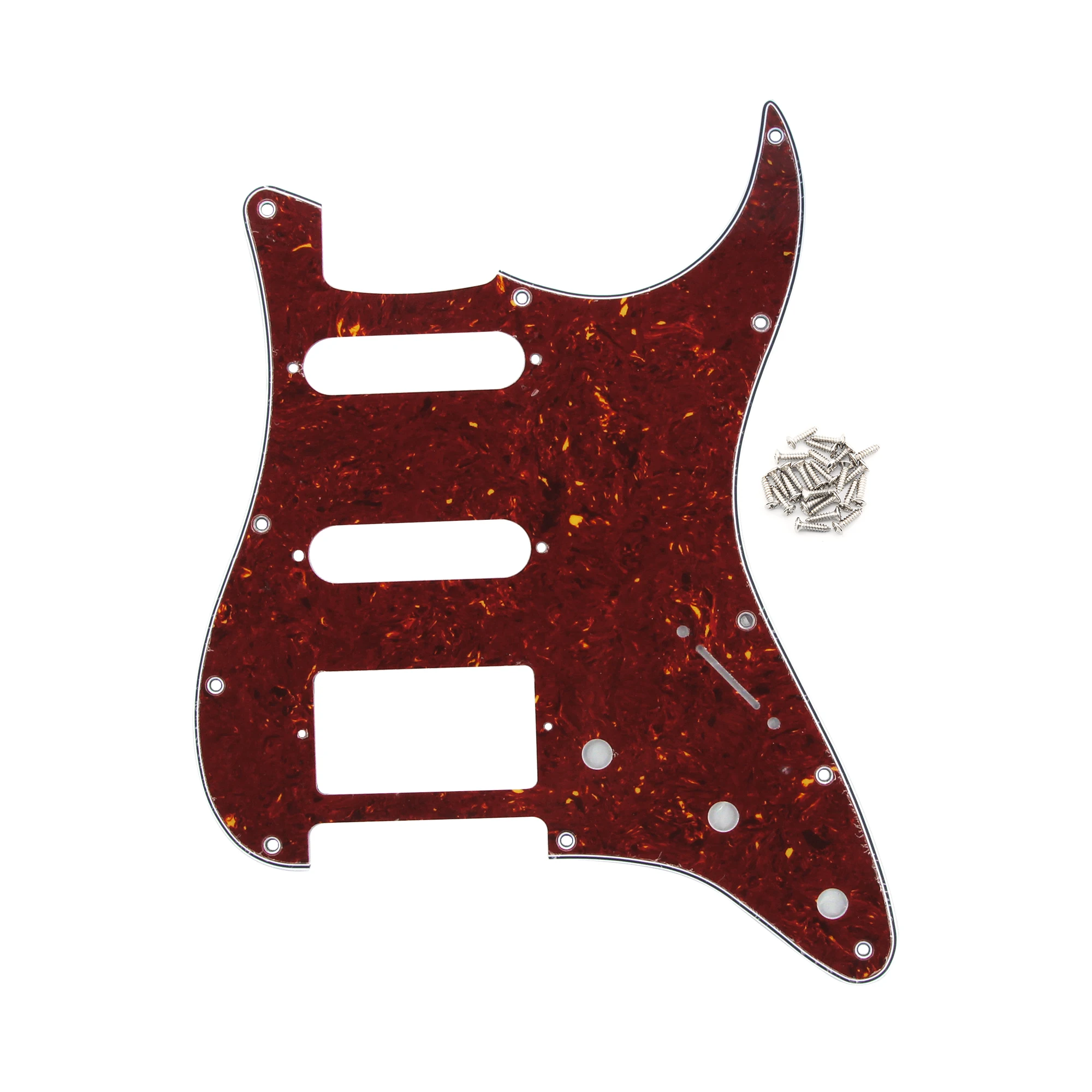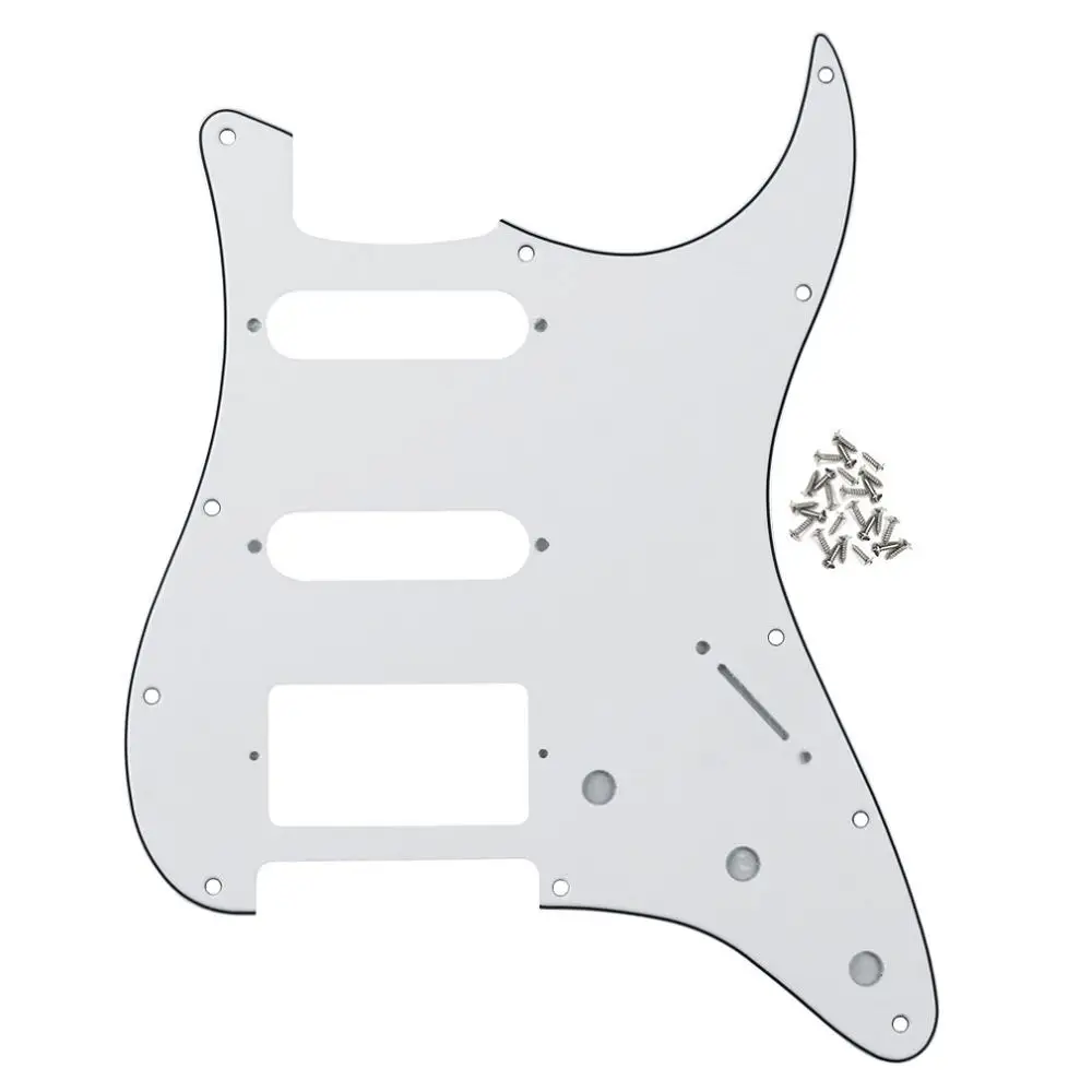 Elevate your guitar’s look and performance with this versatile HSS pickguard designed for ST-style electric guitars. Crafted from durable 3-ply PVC or a combination of 3-ply PVC and 1-ply celluloid, it features enhanced shielding with a pure aluminum foil backing to reduce interference. Measuring to fit most American and Mexican standard Fender-style guitars, it includes 11 screw holes with offset positioning and beveled, smooth edges for a polished appearance. Available in 21 striking colors such as aged pearl, black, cream, mint green, and tortoise shell, this set includes one pickguard and 25 mounting screws—perfect for customizing your guitar’s style and sound.