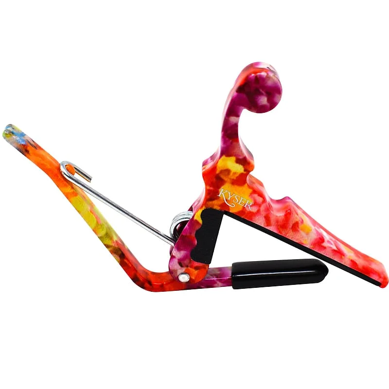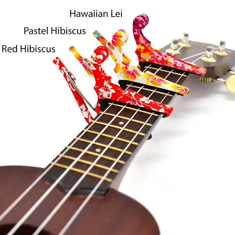 Transform your playing experience with this vibrant set of ukulele capos, designed to add a splash of tropical color to your performances. Each capo features a sleek, metallic finish with island-inspired patterns in bright, lively hues—red and yellow floral motifs, blue and green abstract designs, and white floral details on a red background. Crafted specifically for ukuleles, these capos have a smaller, lightweight body with a flat fretboard compatibility, making them perfectly suited for the instrument’s small necks. The spring tension provides quick, effortless placement and removal, allowing you to switch pitches seamlessly during performances or practice sessions. Elevate your sound and style effortlessly with this cheerful, modern accessory.