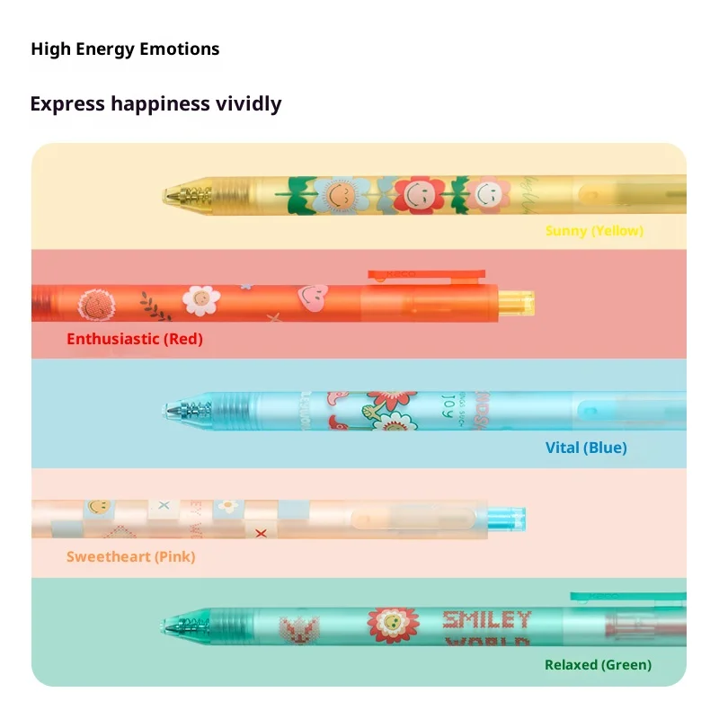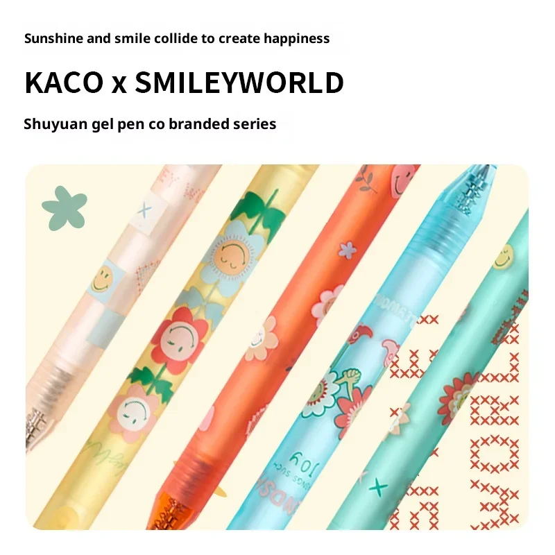 Imagine bringing color and happiness to your everyday writing with this charming retractable gel pen from the KACO x SMILEYWORLD collaboration. Designed to brighten your desk and inspire creativity, this pen features a playful, aesthetic style, decorated with cheerful smiley faces, floral motifs, and whimsical patterns in vibrant colors like Sweetheart Pink, Sunshine Yellow, Passion Red, Energy Blue, and Relaxing Green. With its soft rubber spray finish and comfortable grip, you'll enjoy smooth, pleasant writing whether in school, the office, or during creative projects. The quick-drying, smear-proof gel ink ensures your lines stay clean and vibrant, giving you confidence in every stroke. This pen combines style and function perfectly, becoming your favorite writing companion.