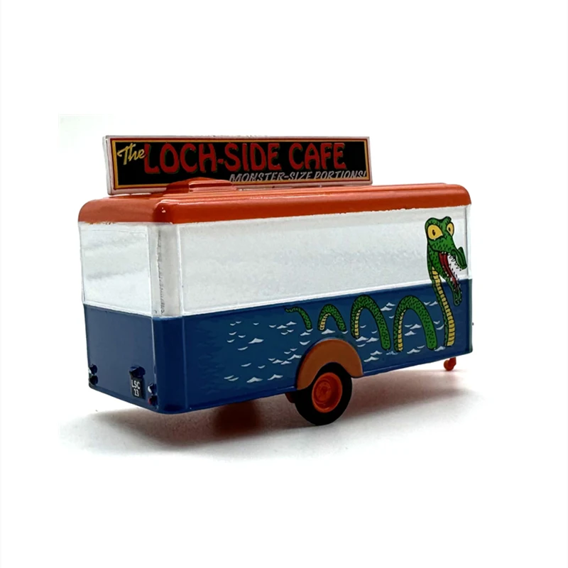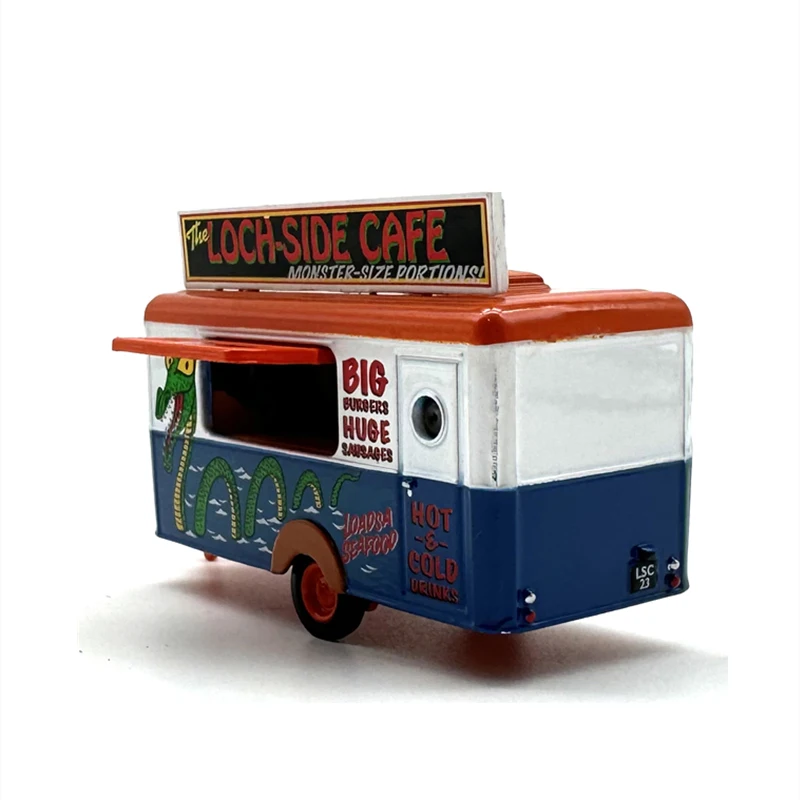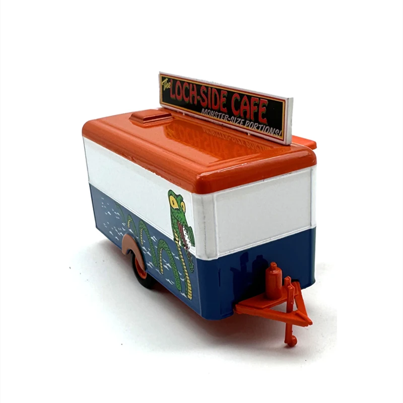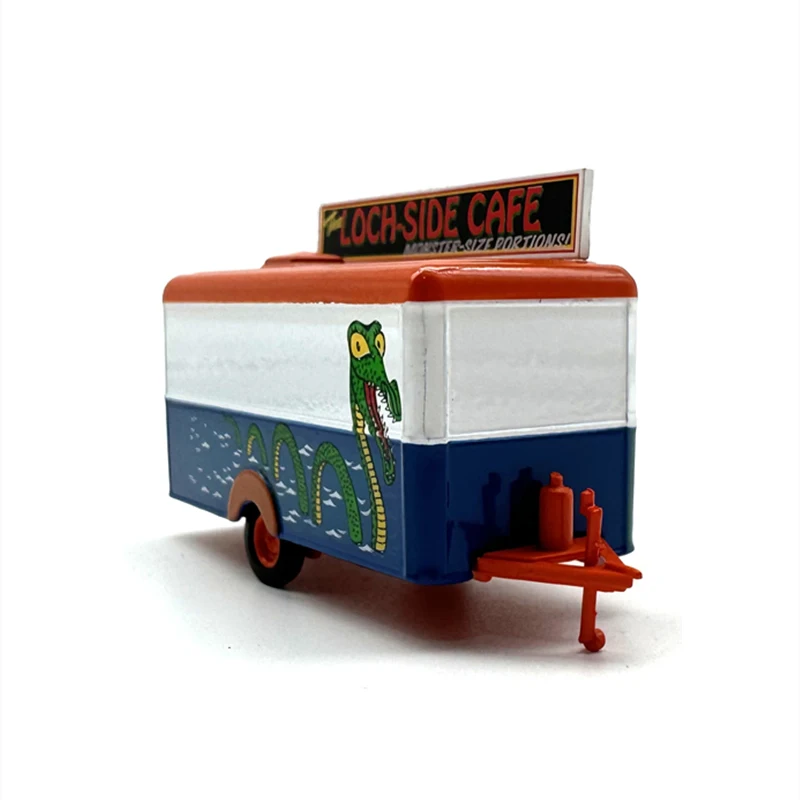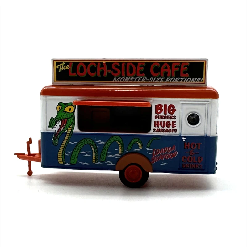 Bring home the charming 1:76 scale diecast alloy mobile trailer model, measuring 7 cm in length, 2.5 cm in width, and 4.2 cm in height. Crafted from alloy and ABS plastic, this static display piece vividly depicts a vibrant lakeside cafe trailer featuring playful graphics, a white upper section with a reddish-orange roof, a bold blue water-themed bottom with red script, and colorful decal details including a cartoonish green crocodile and menu signage. Perfect for adult collectors, this model offers a lively, whimsical aesthetic ideal for display. Designed for those age 14 and up, it’s a unique collectible that captures a fun, vintage-inspired scene with intricate detail.
