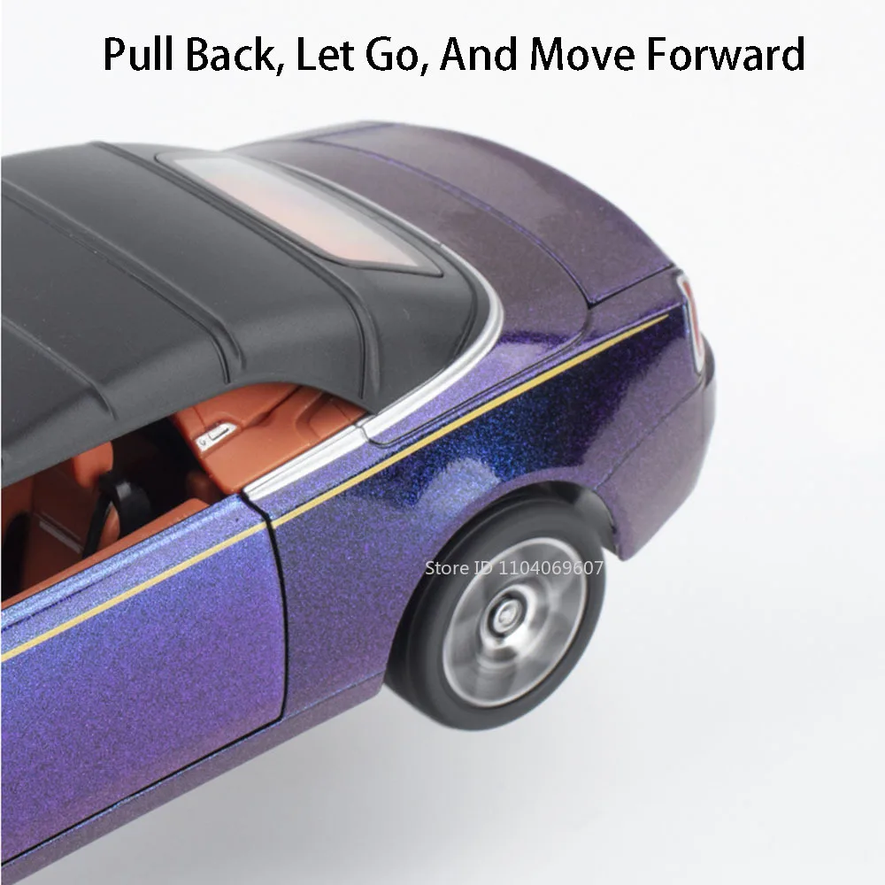 Experience the luxury and craftsmanship of this stunning 1:24 scale Rolls Royce Dawn Spectre model. With its eye-catching light blue alloy body, this detailed replica offers a sleek and sophisticated appearance. The convertible design features a transparent windshield, revealing an orange interior with finely crafted seats and dashboard. Open the doors, trunk, or engine hood to explore the intricate internal components, showcasing impressive realism. The model's rubber tires with alloy wheels and shock absorption springs ensure durability and a smooth visual aesthetic. Perfect for display or interactive play, this model includes sound and light functions, making it feel lively and authentic. A true collector’s piece for car enthusiasts and admirers of luxury craftsmanship.