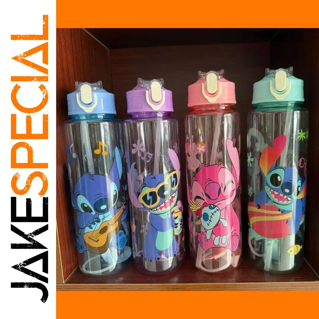 - This 800ml plastic water cup features vibrant, lively character designs, perfect for fans of “Lilo and Stitch,” with colorful cartoon images and decorative motifs like musical notes and hearts.