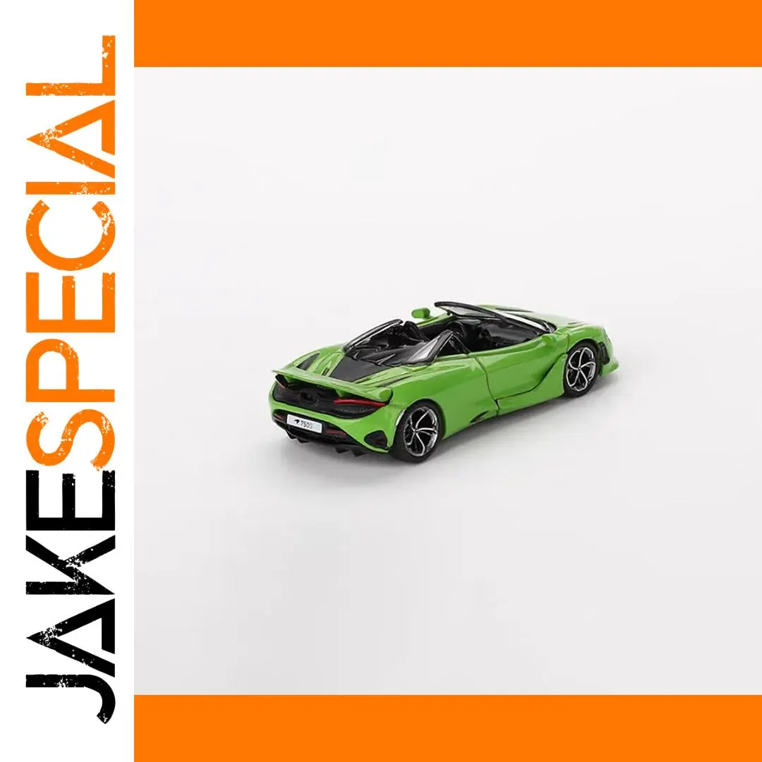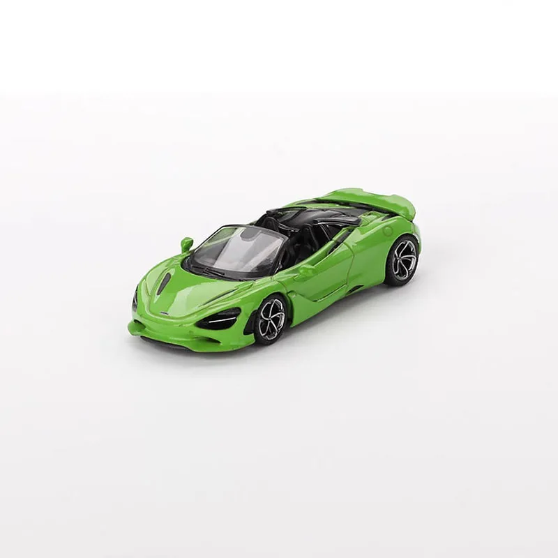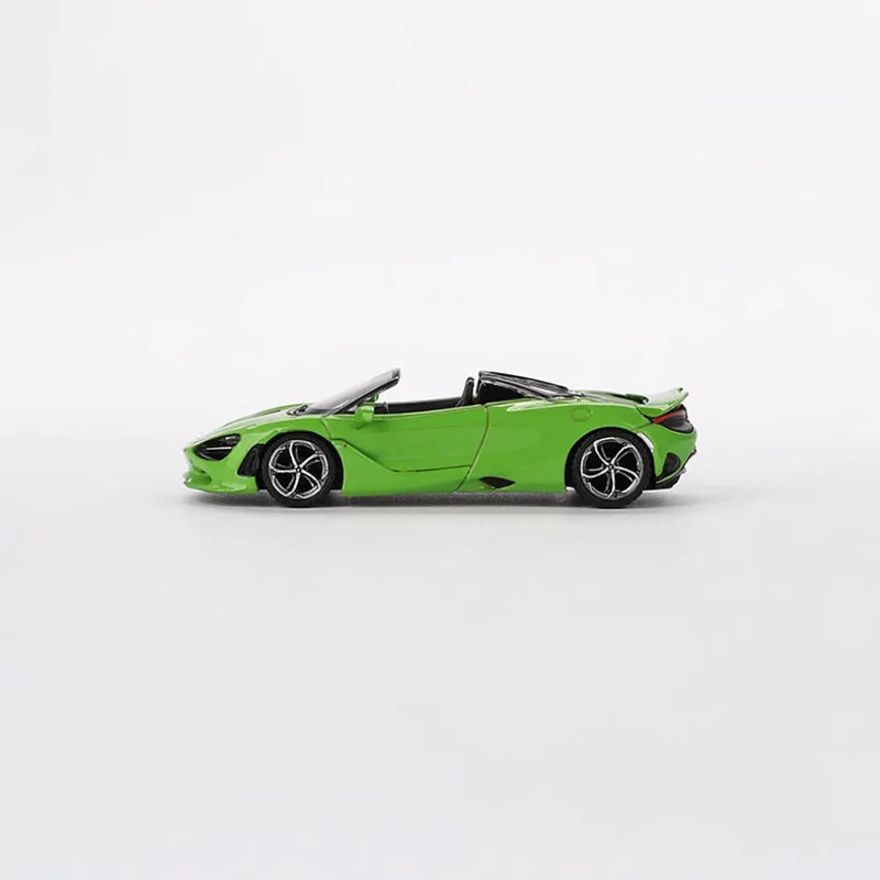 Experience the sleek elegance of this this diecast MINIGT 1:64 scale model, perfectly capturing the modern sports coupe's aerodynamic design. With a striking lime green exterior, the model commands attention and showcases fine details like side air intakes, narrow angular headlights, and a subtle grille. The black roof contrasting with the vivid body hints at a convertible design, with an open-top revealing a matching black interior. Multi-spoke silver rims on black wheels give it a high-performance aesthetic. Made from alloy and plastic, this static display model is ideal for collectors and enthusiasts who appreciate detailed craftsmanship and contemporary style. Picture your display shelf now featuring this eye-catching miniature.