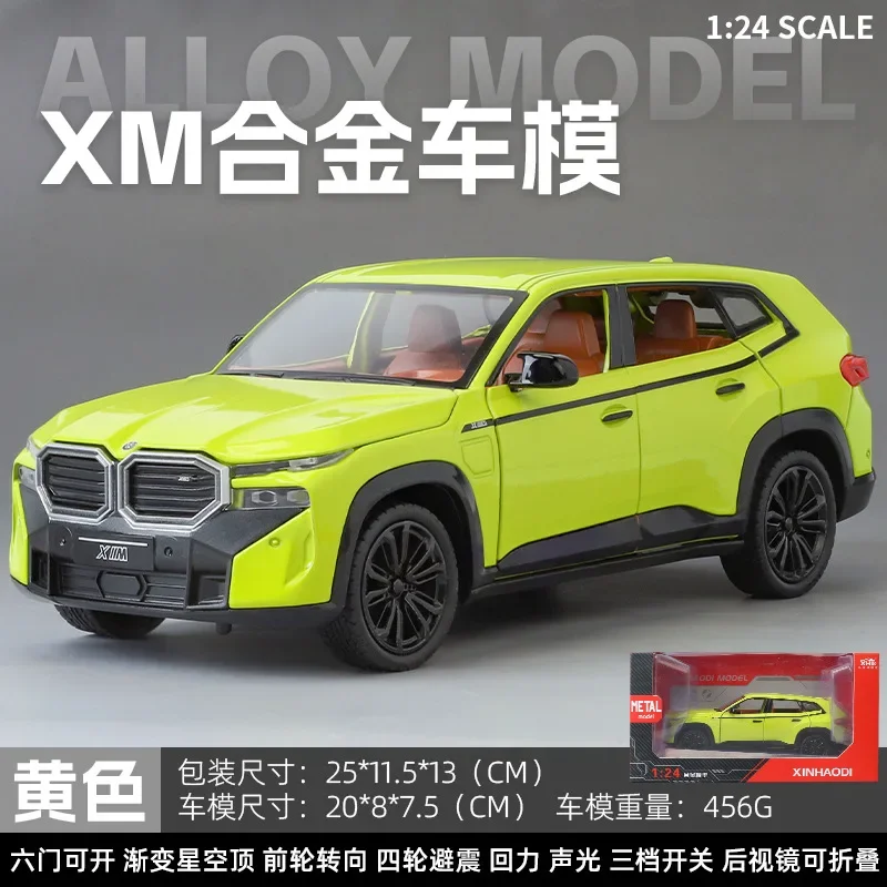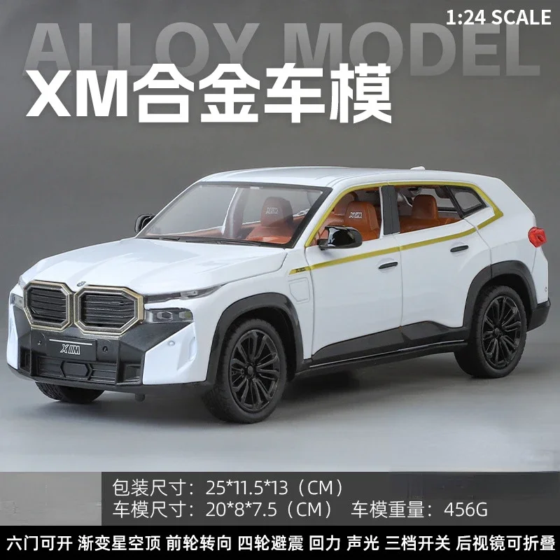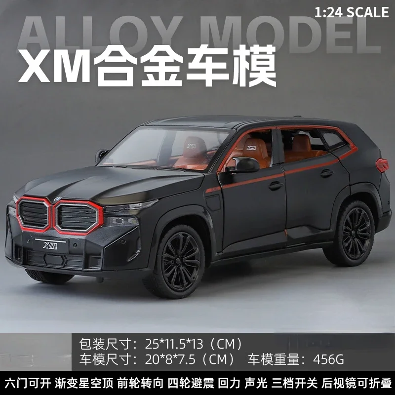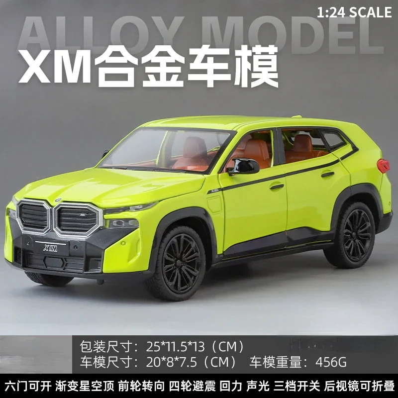 - The model measures at a 1:24 scale, accurately replicating the BMW XM SUV’s proportions and design features with high precision detail.