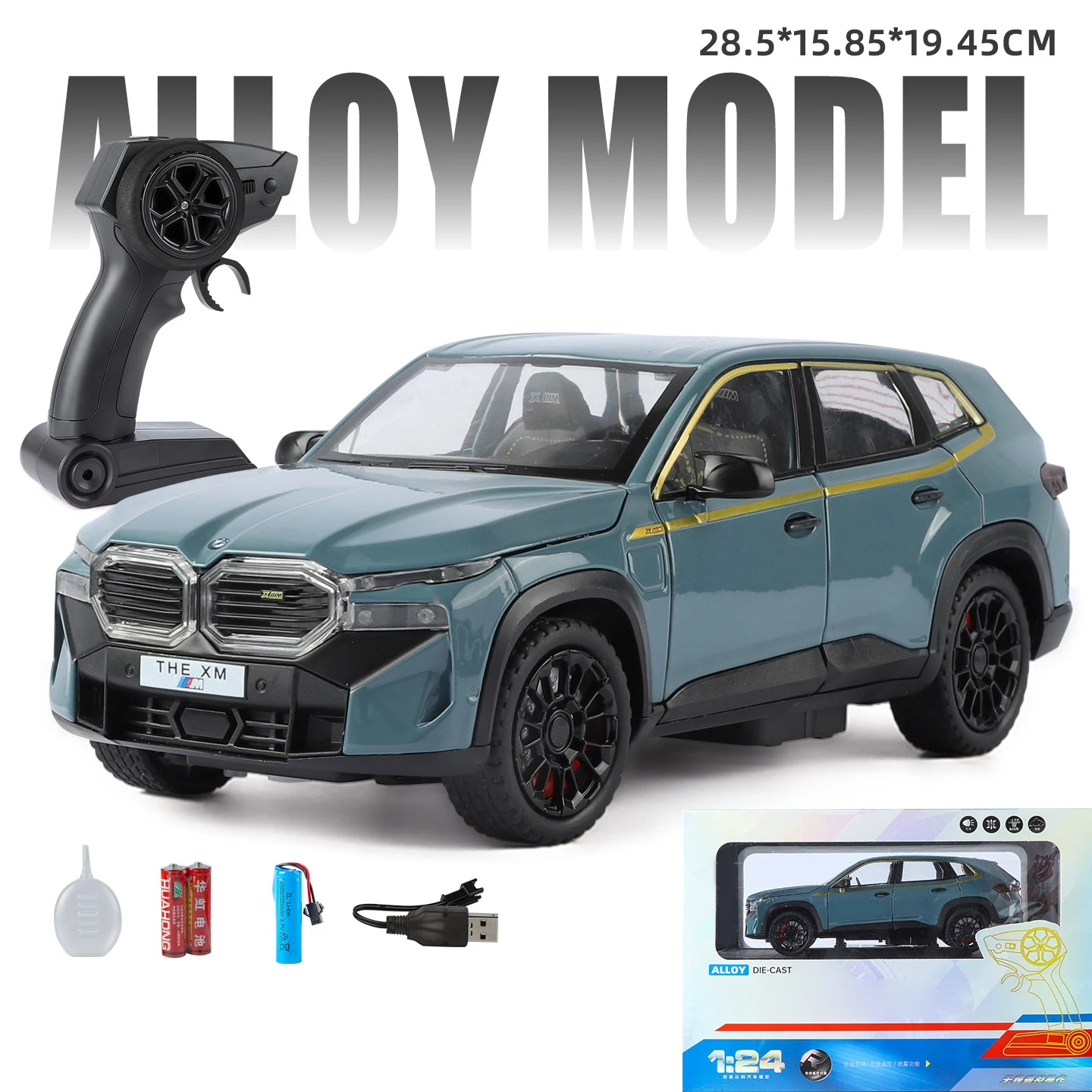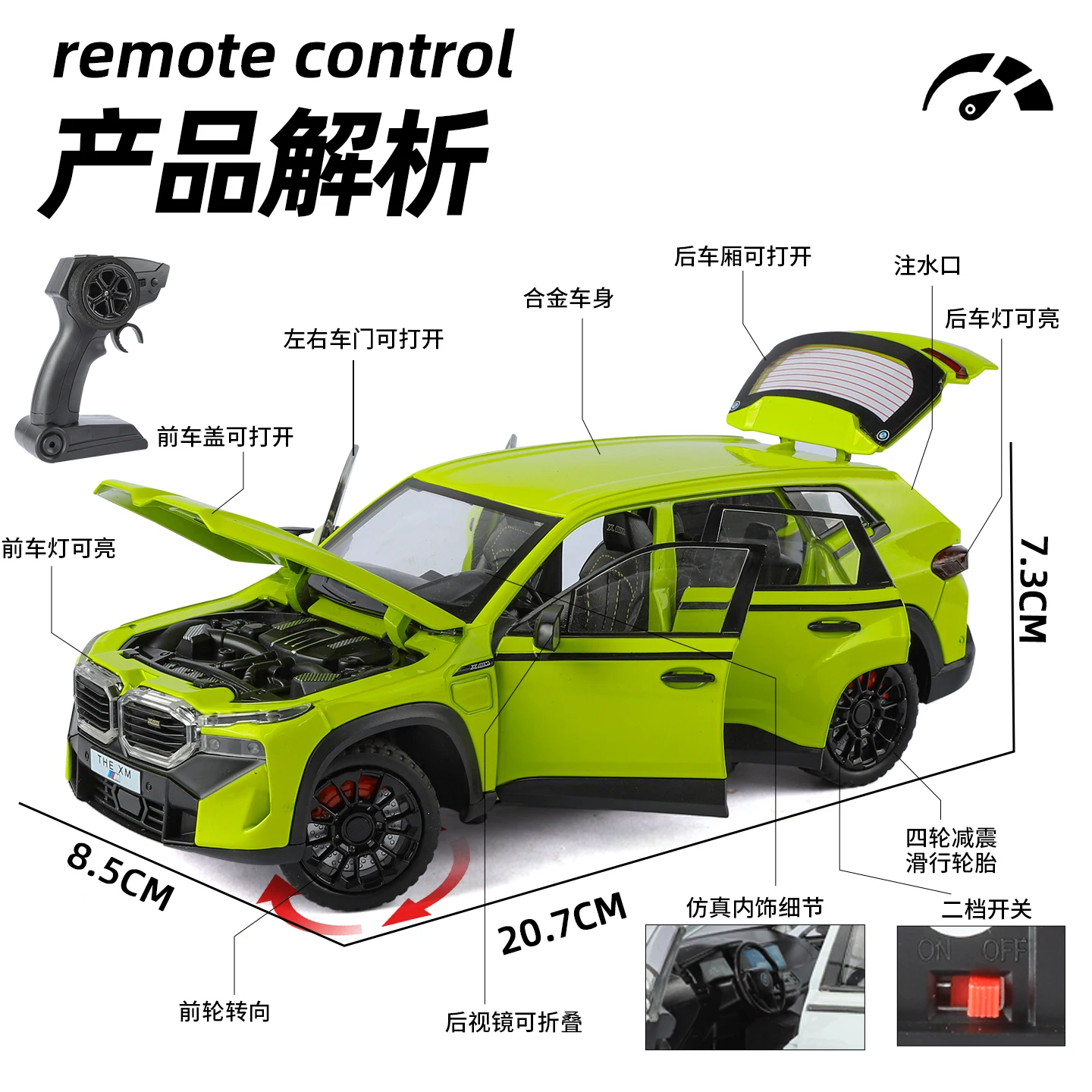 Experience the thrill of off-road adventure with this highly detailed 1:24 scale die-cast metal SUV model, featuring alloy components for realism and durability. Its vibrant lime green body is accented by sleek black details, including side mirrors, window frames, and a trim line along the roof, creating a bold and rugged aesthetic. The model boasts a realistic grille with double hexagonal outlines, slender headlights, and pronounced wheel arches with multi-spoke black rims and detailed treaded tires. Perfect for indoor display or collectors, it includes an electronic remote control with batteries (included) and is available in multiple color options: black, blue, white, and green.
