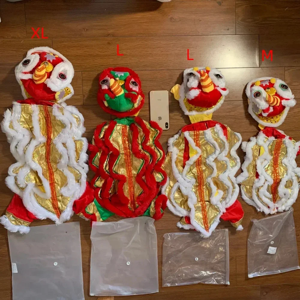 Experience your pet's standout moment with this eye-catching lion dance costume designed for special celebrations. Crafted from durable polyester, shimmering sequins, and soft cotton, it offers comfort and long-lasting wear. Available in sizes M, L, and XL, it fits pets weighing from about 3kg to 6.5kg, making it perfect for small to medium breeds. The costume features a traditional Chinese lion mask in lively green with red, yellow, and white accents, complete with a playful cartoonish eye and sparkling sequins that catch the light. Its shimmering gold body adorned with detailed embroidery and colorful patterns captures the majestic movement of a lion. Fuzzy, red trim along the edges adds a whimsical, furry touch, making your pet look festive and adorable for parties or photo sessions.