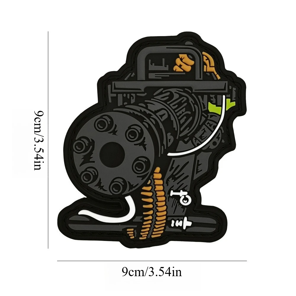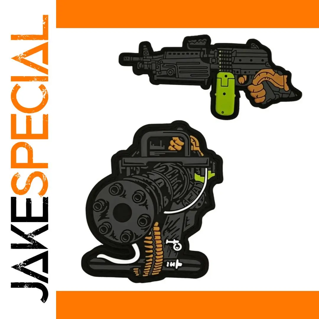 - The first patch depicts a cartoon-style military weapon with bold black outlines and a playful green object, adding a fun, aggressive vibe to your jackets, backpacks, or helmets.