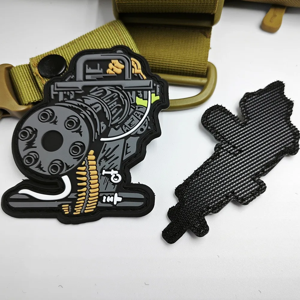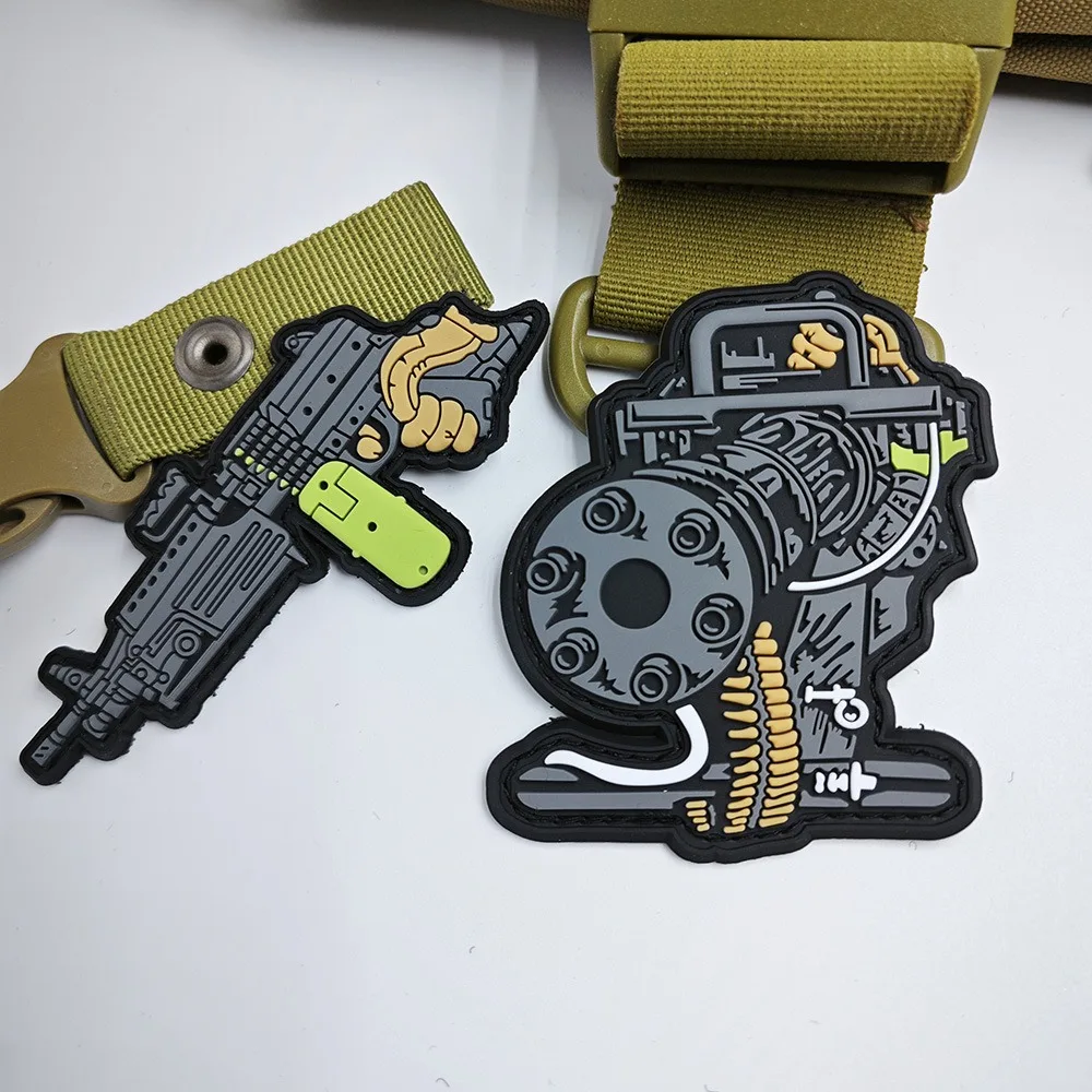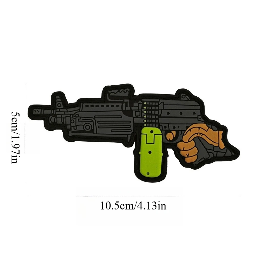 Imagine adding a touch of bold, playful military style to your clothing or equipment with these eye-catching patches. Featuring striking 3D rubber designs, these badges stand out with vivid colors and detailed embroidery. The first patch showcases a cartoon-style depiction of a military weapon, outlined in black with mechanical internal details and a humorous green smiling object hanging beneath, giving it a unique, lively character. The second patch presents a realistic, textured grenade detailed with contrasting orange, yellow, and green accents, capturing the essence of military toughness. Crafted with durable PVC, nylon, and polyester, these patches are easy to attach and perfect for customizing your gear, making every piece uniquely yours while showcasing your tactical style.