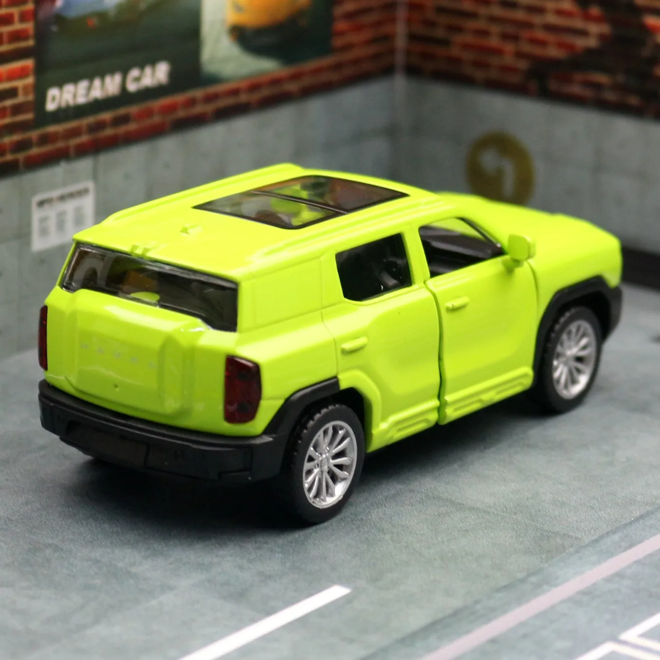 Imagine adding this eye-catching miniature to your collection—its bright, vivid neon green finish instantly draws attention and sparks conversations. Crafted from durable diecast metal, this 1/40 scale replica masterfully captures the sleek, modern design of the Haval Cool Dog hybrid SUV. The vehicle features a rounded front with a detailed black grille, complemented by rectangular headlights that add realism. Its smooth, curved hood flows into an expansive windshield, with matching body-colored side mirrors enhancing its lifelike look. Silver alloy wheels with intricate multi-spoke details contrast beautifully with black wheel arches. With open-front doors revealing a glimpse of interior details, this model offers a realistic and dynamic aesthetic, fitting seamlessly into any display or play setting on a miniature street scene.