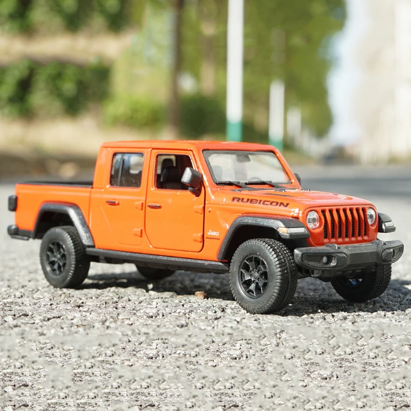 Experience the rugged charm of the Jeep Wrangler 2020 Gladiator Robin Hood Pickup in a detailed 1:24 scale diecast alloy model, crafted from high-quality alloy and plastic. Boldly finished in vibrant orange with contrasting black accents on the bumpers, side mirrors, and wheel rims, this collectible captures a realistic, boxy silhouette with detailed features like a front grille with vertical slats, round headlights, and intricately designed door handles. The transparent plastic windows reveal a scaled interior with seats and a dashboard, while textured tires mimic off-road tread patterns, making it an ideal addition for adult collectors and enthusiasts seeking authenticity and craftsmanship.