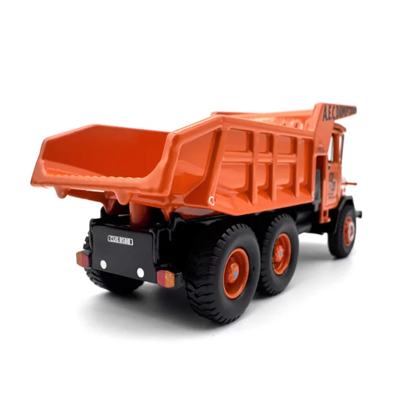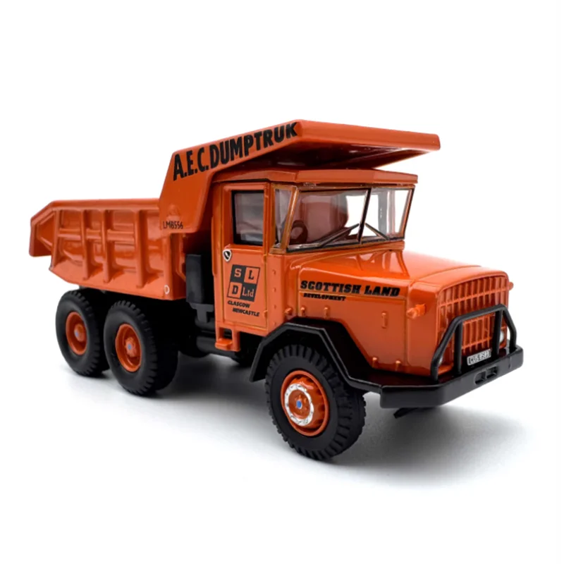 Immerse yourself in the detailed craftsmanship of this vibrant orange AEC690 dump truck diecast model, scaled at 1/76. Crafted from alloy and plastic, it captures the rugged industrial design with realistic features, including a raised dump bed with textured surface, precise proportions, and authentic markings like “SCOTTISH LAND.” The model's rectangular cab with clear plastic windows reveals interior detailing, while the black accents on the bumper, wheel arches, and grille enhance its visual appeal. The sturdy black tires with detailed treads and orange rims provide a striking contrast, adding depth and realism. This collectible piece is perfect for display, collection, or gifting to enthusiasts who appreciate detailed miniatures of industrial vehicles.