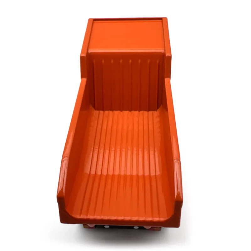 - The raised dump bed features a textured surface and visible hinges, illustrating its functional design, which adds to its dynamic and rugged appearance.