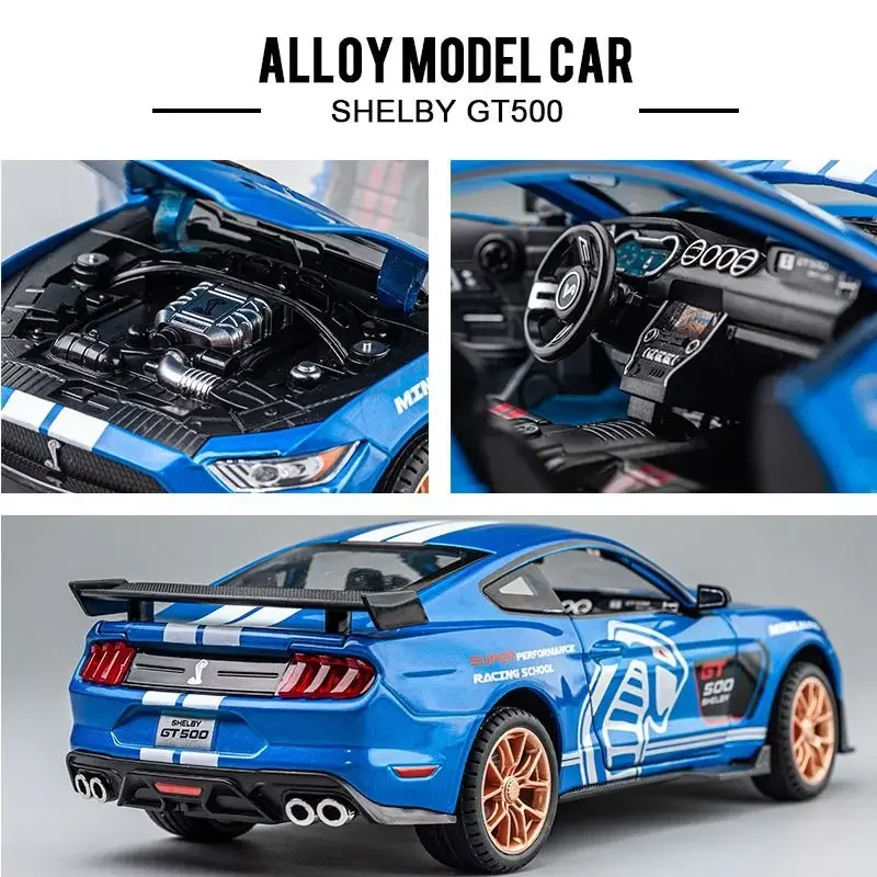Experience the thrill of high-performance with this 1:24 scale diecast model of the Ford Mustang GT500, featuring a vibrant orange high-gloss finish with bold black racing stripes and detailed black graphics, including a cobra logo. Crafted from durable metal, it showcases intricately molded features such as door lines, exhaust outlets, side mirrors, and aerodynamic contours. The model is fitted with metallic gold alloy rims with a multi-spoke design and textured rubber tires with realistic treads. The front boasts a detailed grille, black air intakes, and clear plastic headlights with internal detail, while transparent windows reveal a meticulously designed interior with molded seats, dashboard, and steering wheel. Lighting features powered by batteries add a dynamic display, making this an impressive collectible for enthusiasts.