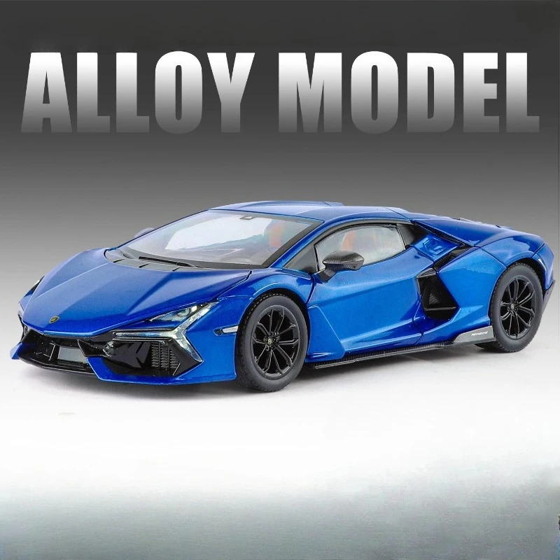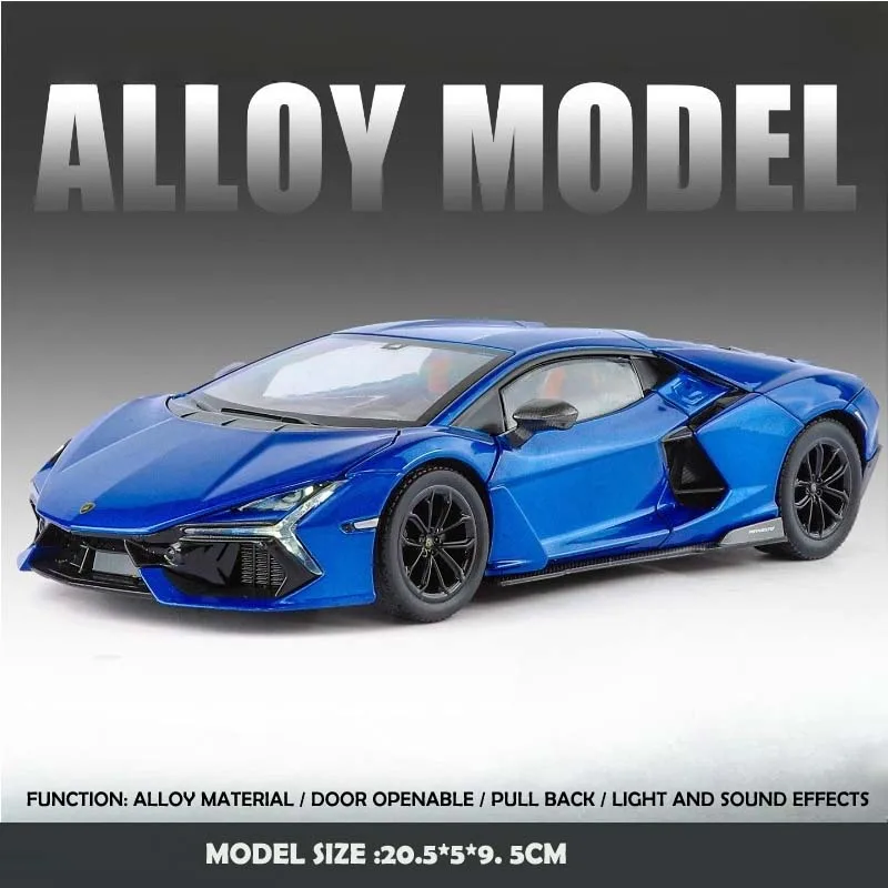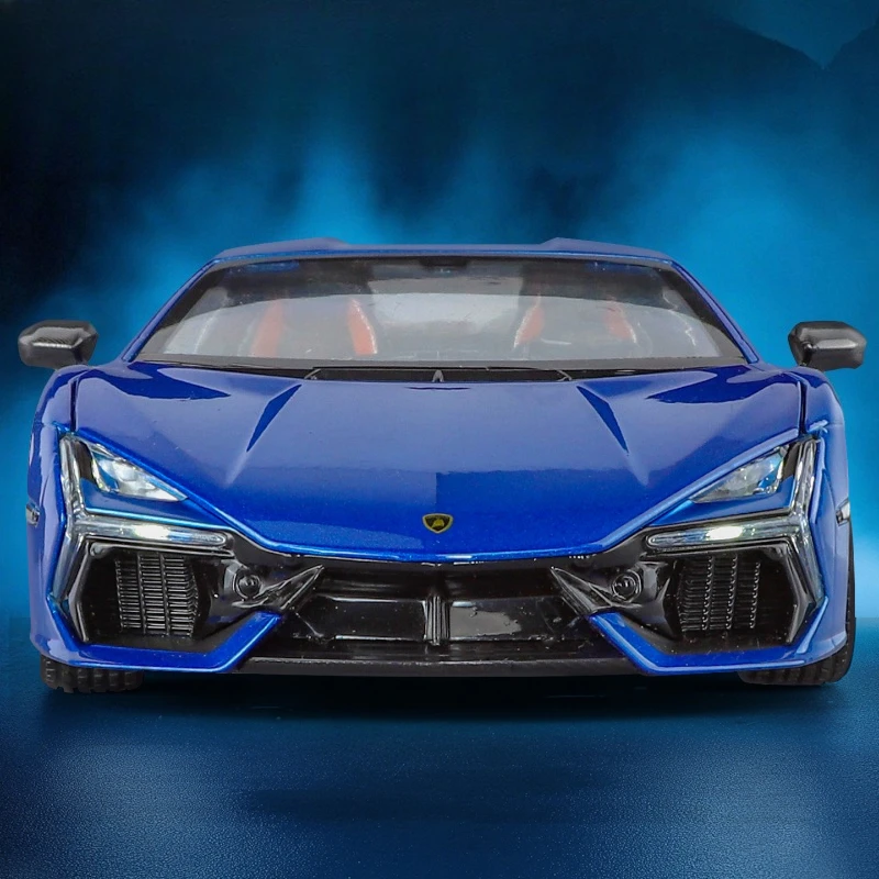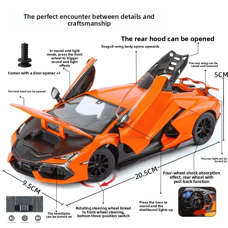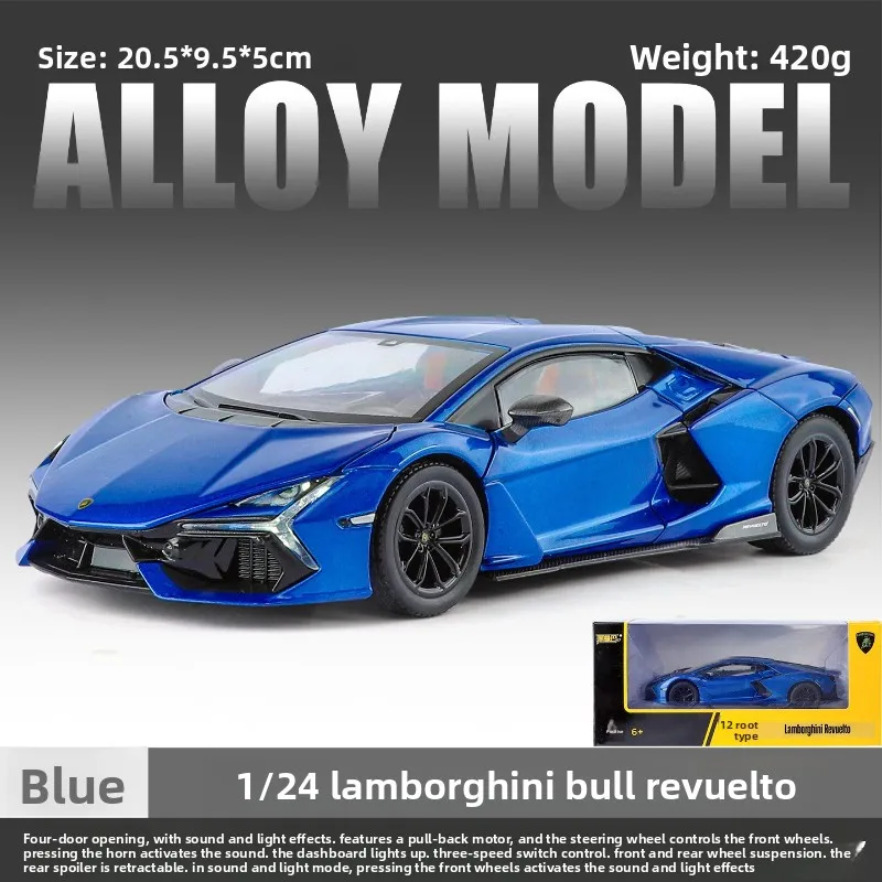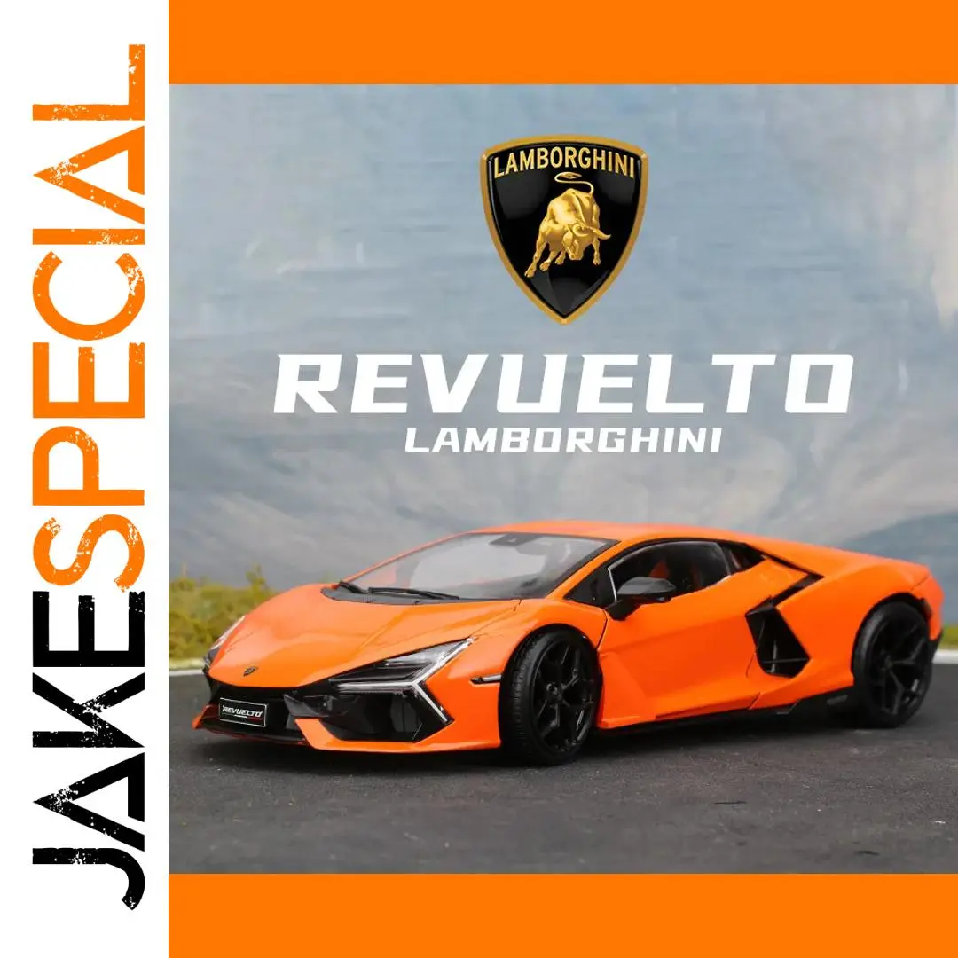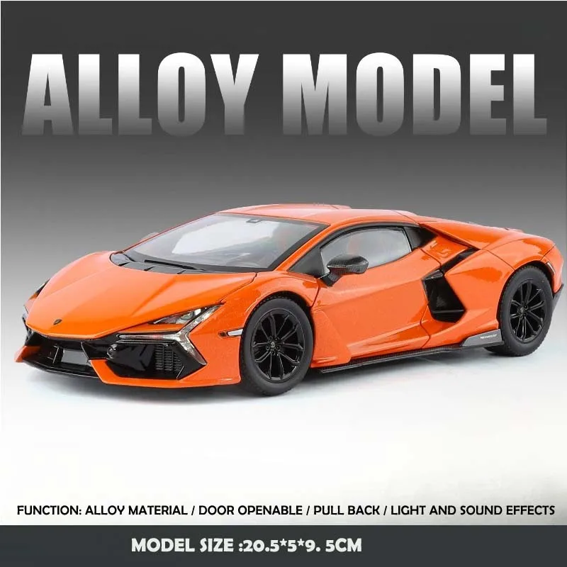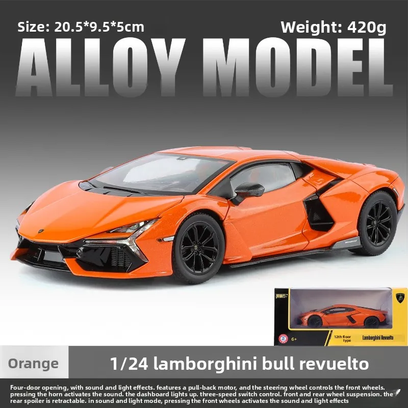 Experience the thrill of Lamborghini Revuelto with this detailed 1:24 diecast miniature model, featuring a vibrant orange glossy finish and precise diecast craftsmanship. Its aerodynamic body highlights sharp, angular lines, sculpted contours, and realistic vent details. The model includes functional light and sound features, with a metal body, black multi-spoke alloy wheels, textured rubber-like tires, and transparent windows revealing a detailed interior. Suitable for collectors aged 4 and above, it measures approximately to scale, operates on 100-240V for display, and offers multiple color options: orange or blue, with or without box. A striking addition to any automotive collection.