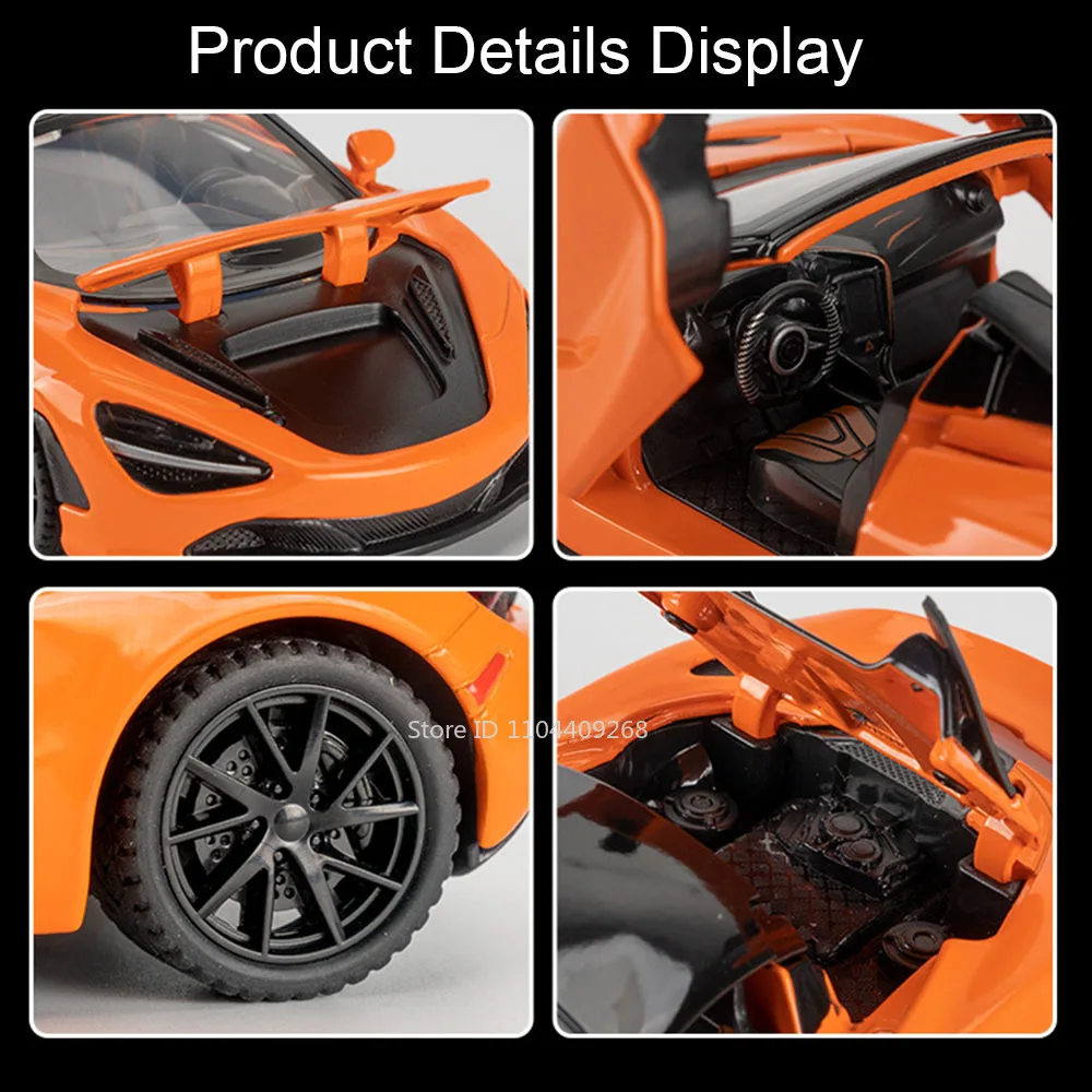 Experience the thrill of high-speed luxury with this detailed orange McLaren 720S Senna model. Crafted with an alloy body and glossy finish, it captures the sleek curves and aerodynamic details of the real supercar. The model features intricately molded headlights with bright LED-like lighting, a prominent front grille, and sculpted air vents that add to its dynamic allure. Its gull-wing doors open upward, revealing a detailed interior with dashboard, steering wheel, and seats. The black alloy wheels and rubber tires with precise treads enhance its sporty look. Designed with durability in mind, this miniature replica offers a true-to-life display of luxury, performance, and cutting-edge design, making it a perfect addition to any collection or display shelf.