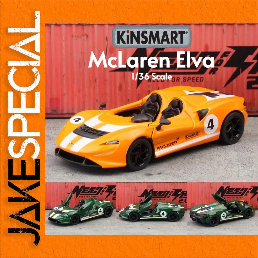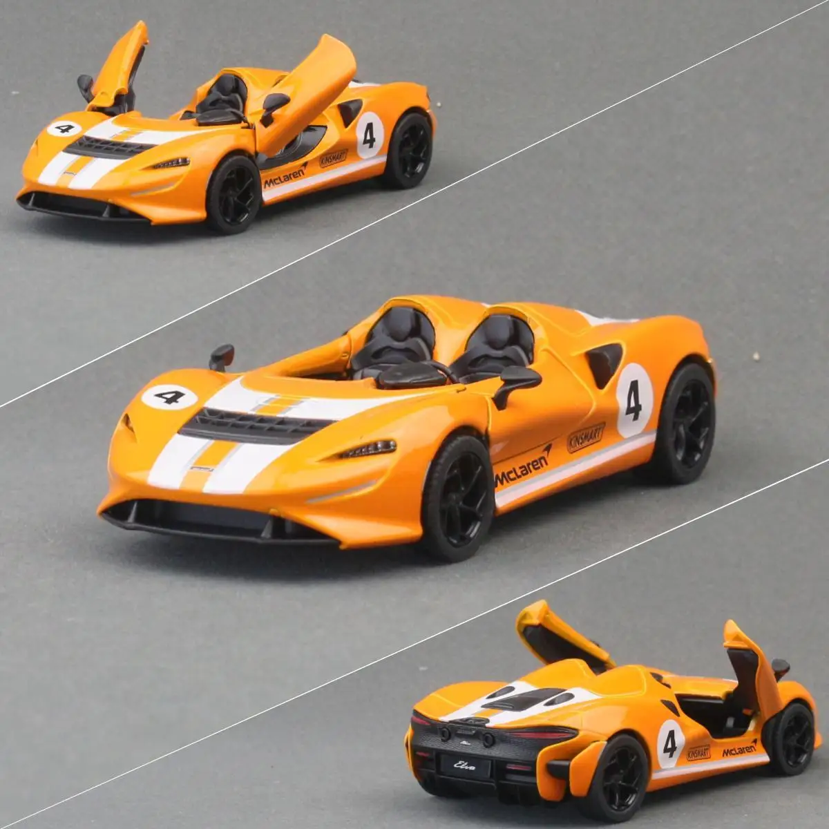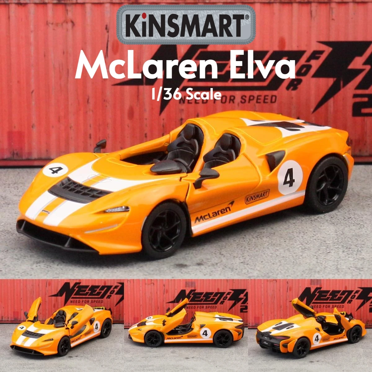 Experience the thrill of racing with this detailed 1/36 scale McLaren Elva diecast model from the KiNSMART Toy Car Collection. Its sleek, aerodynamic silhouette features smooth curves and a low profile, capturing the essence of high-speed performance. The vibrant orange body accentuated with crisp white racing stripes, and racing graphics—including the number 4—make it truly eye-catching. The front showcases a black grille and slender headlights, while side mirrors are neatly mounted on black supports. Inside, you'll see realistic driver seats, adding depth and authenticity. The black wheels with multi-spoke rims and rubber-like tires enhance its realistic look. This model combines bold style with expert detailing, perfect for display or collection.