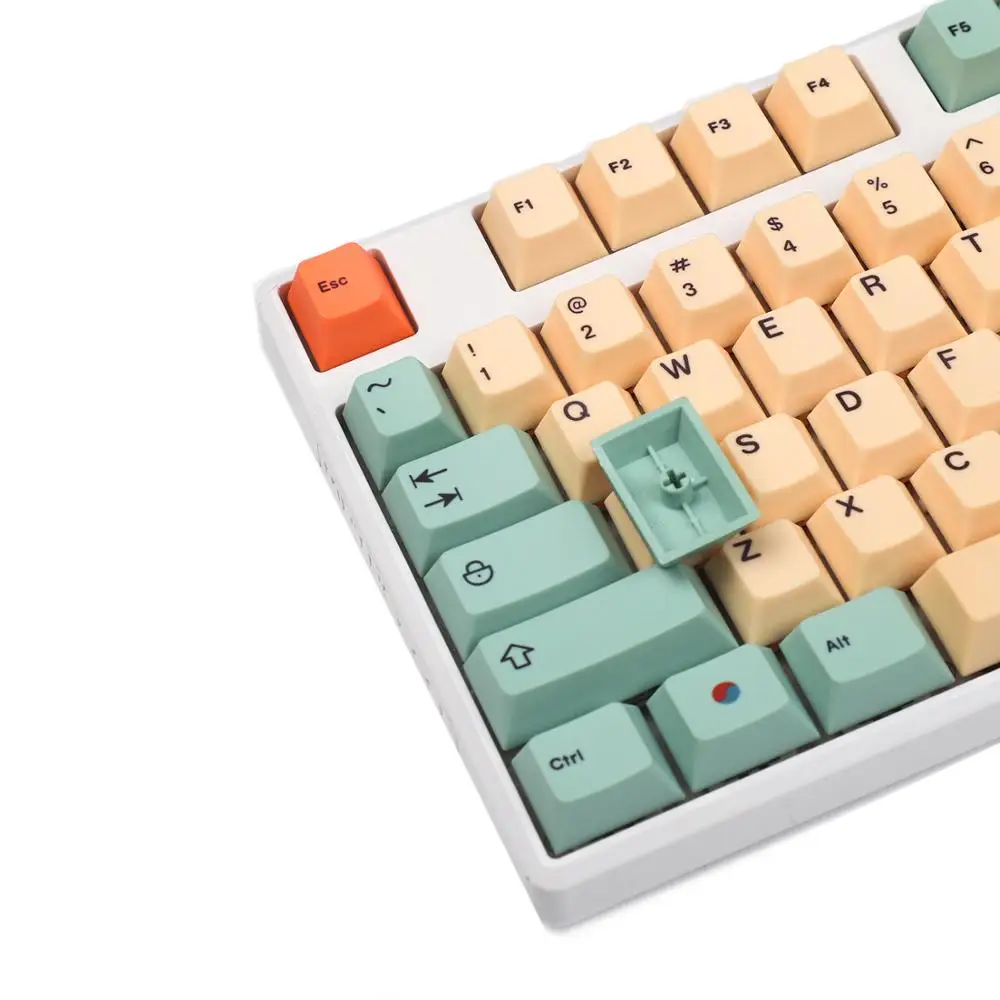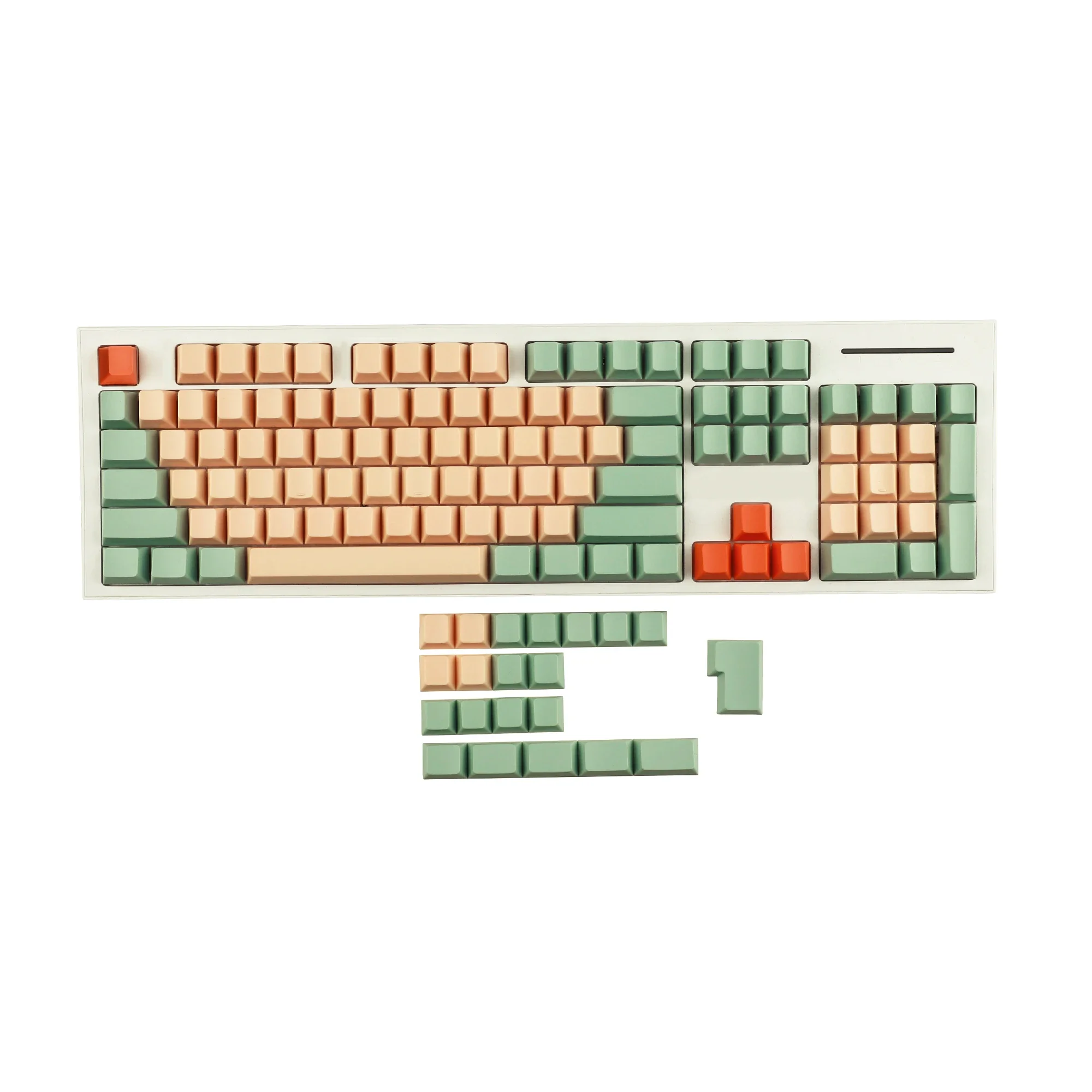 Transform your keyboard with this stunning dye-sublimated PBT keycap set, featuring a cherry profile with a sleek, smooth surface. Designed for MX switches, these durable keycaps have a thickness of about 1.5mm, ensuring a satisfying typing experience. The set includes 125 keys compatible with multiple layouts such as ANSI, ISO, 104, 87, 61, and 68-key keyboards. Its vibrant pastel shades—mint green, beige, light orange, and bright orange—create a lively and inviting aesthetic. Perfect for customizing your keyboard, this set elevates your workspace with a blend of playful colors and premium quality materials, making every keystroke a pleasure and giving your setup a fresh, modern look.