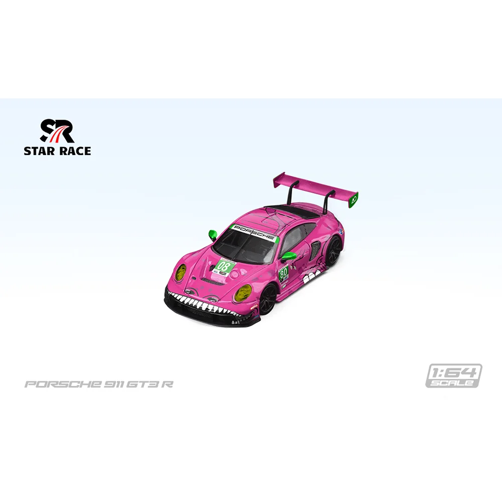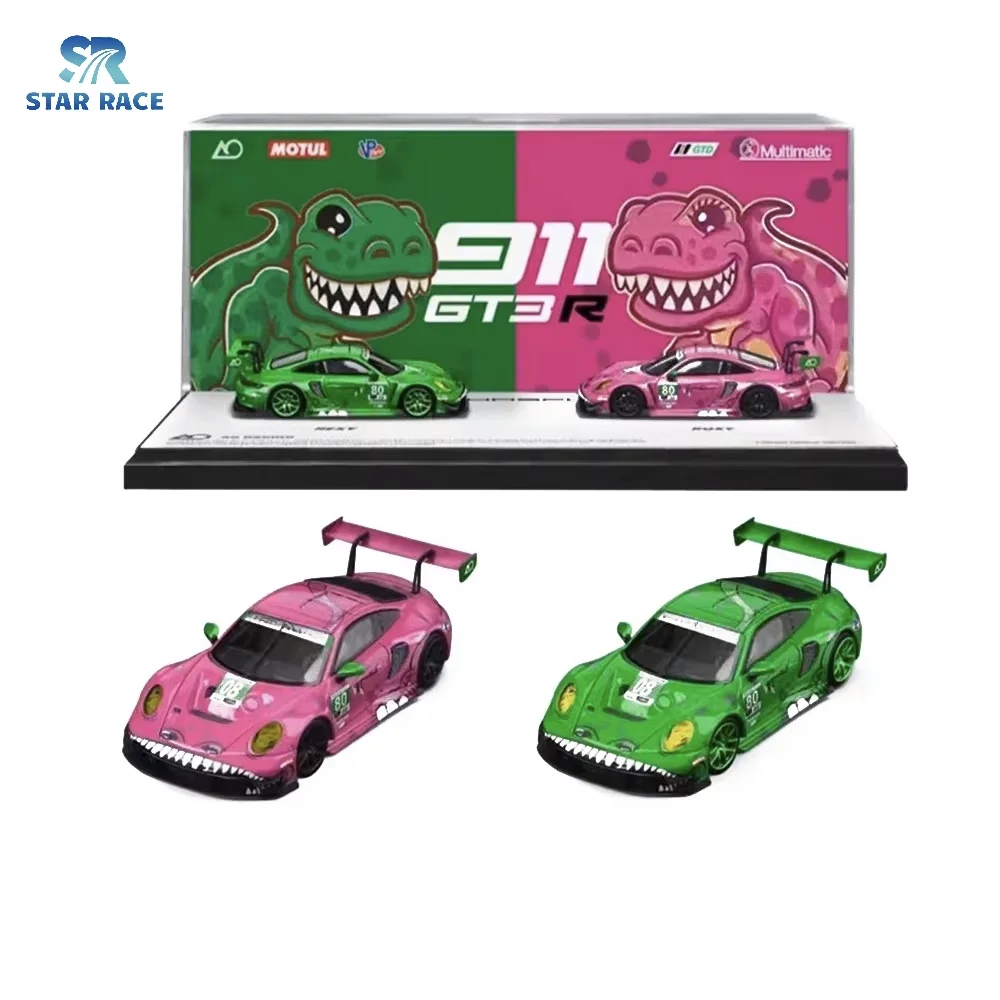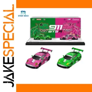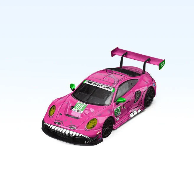 Step into the world of high-speed racing with this highly detailed diecast model of the Porsche 911 GT3 R. Crafted with precision, it measures 1:64 scale and is made of durable metal, offering a sleek, shiny finish that captures every aerodynamic curve. The model features striking colors—bright pink and vivid green—each accented with black racing stripes, wheels, and side mirrors. Its whimsical design includes playful, exaggerated facial features—large eyes on the hood and a broad grin on the front bumper—which bring an animated, collectible charm. The rear wing spoilers in matching vibrant colors enhance its sporty appeal. Perfect for display and enthusiasts, this model combines realism with fun, creating an eye-catching piece for any collection.