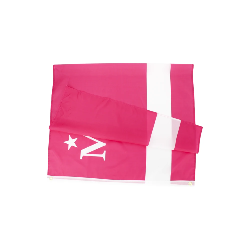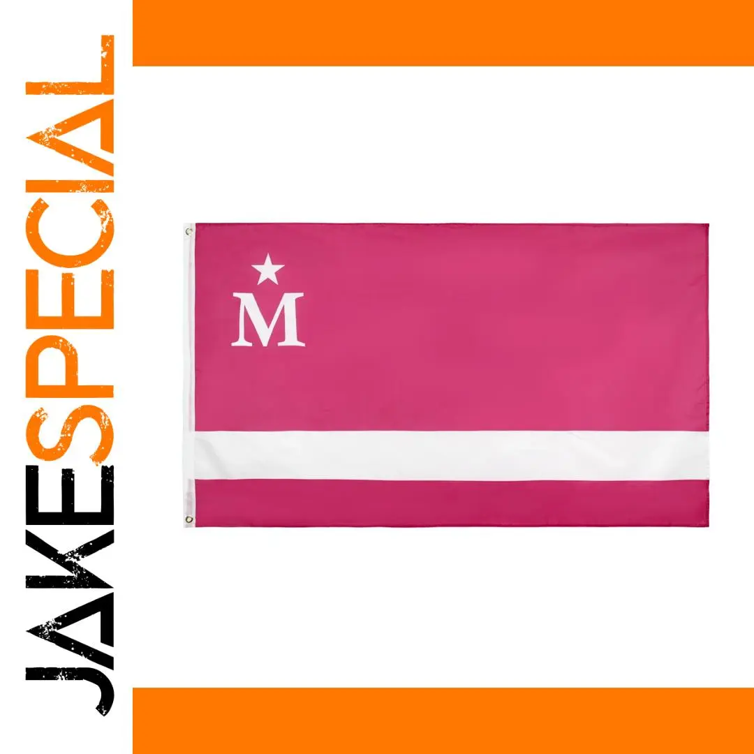 Experience the striking visual impact of this 90×150 cm polyester flag, designed with bold colors and high-contrast symbols. The vibrant pink background instantly grabs attention and adds a lively, energetic touch to any space. The inclusion of a white star symbol near the top left corner, positioned above a prominent white uppercase letter “M,” creates a recognizable and memorable design. A broad white stripe traverses the lower third, providing a crisp contrast that emphasizes simplicity and clarity. Crafted from lightweight super-Tex fabric, it offers durability and a smooth finish suitable for both indoor and outdoor decoration. Hemmed edges and metal grommets ensure easy hanging and long-lasting presentation, perfect for personal or professional use.