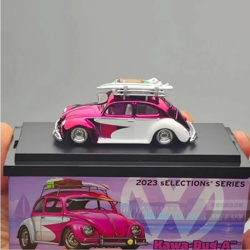 Imagine yourself proudly displaying this stunning Volkswagen Beetle diecast model in your collection. Its eye-catching hot pink finish, accented with white and purple details, makes it impossible to ignore. The rounded, vintage silhouette captures the authentic charm of the classic Beetle, complete with detailed front headlights, chrome-like grille, and stylish wheel arches with shiny hubcaps. The roof features a sleek rack holding a rectangular accessory, adding an adventurous touch that sparks your imagination. The rear showcases a rounded trunk and taillights, while the semi-transparent windows give a glimpse of its interior depth. Perfectly crafted from alloy and plastic, this 1/64 scale model is built for display, making it an ideal gift or collectible for enthusiasts who love unique, detailed miniature cars.