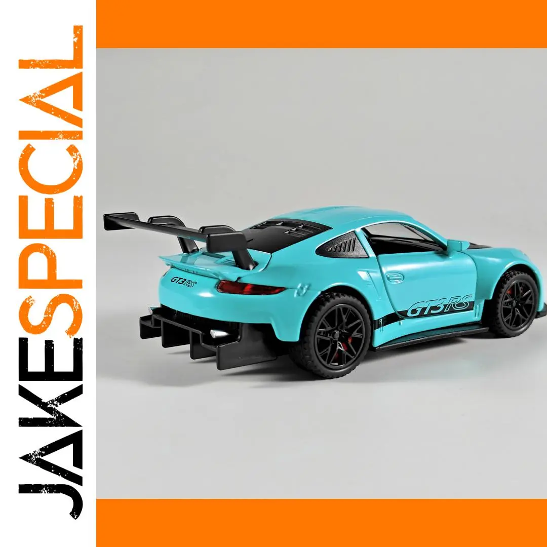 Experience the thrill of racing with this detailed 1:32 scale Porsche GT3 RS diecast model, designed for collectors and racing enthusiasts. Its glossy turquoise finish immediately captures attention, while the sleek, aerodynamic silhouette mimics the real high-performance sports car. The sculpted body lines, black accents on side vents and window frames, and the prominent rear spoiler deliver an authentic, racing-inspired look. This model features narrow, elongated red taillights that add an aggressive stance, complemented by matching side mirrors and door handles for realism. Made from high-quality metal, it’s durable and exudes premium craftsmanship. The sound and light functions enhance the interactive experience, making it an eye-catching display piece or an impressive gift for adult collectors.