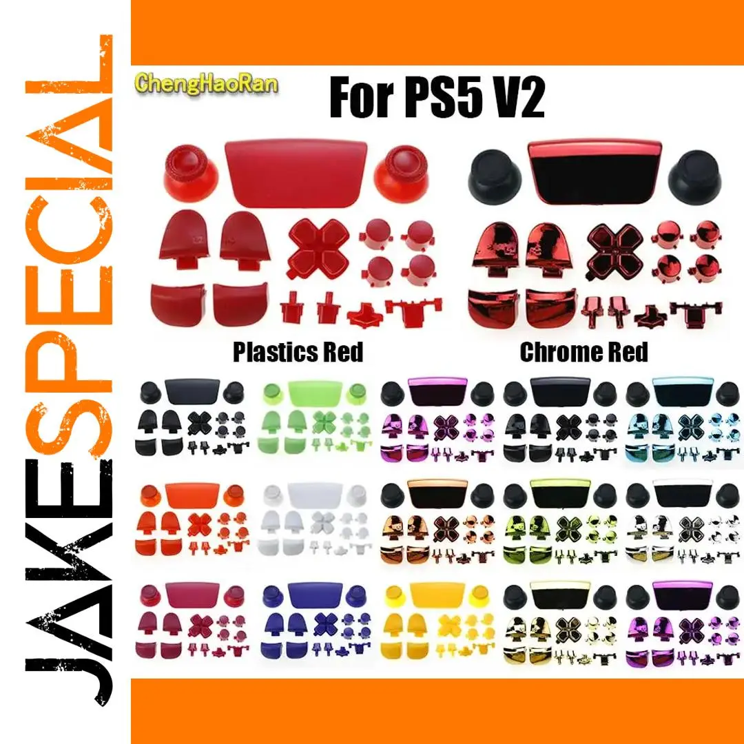 Enhance and customize your Sony PS5 V2 (BDM-020) controller with this comprehensive full set of replacement plastics and chrome buttons, including thumb sticks, joystick caps, L1, R1, L2, R2 buttons, and a D-pad button. Featuring a wide variety of vibrant colors and finishes such as red, chrome light purple, chrome blue, chrome yellow, chrome purple, white, chrome green, yellow, chrome gold, green, chrome red, rose red, orange, chrome black, blue, peach red, black, chrome silver, and blue purple, these high-quality parts provide a modern, glossy aesthetic. Designed for adult collectors, they are non-electrical, free from harmful chemicals, and perfect for personalized controller upgrades.