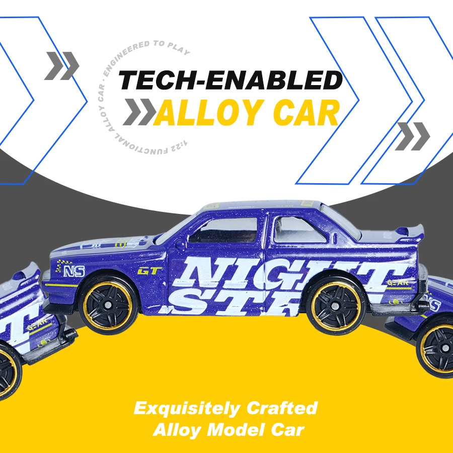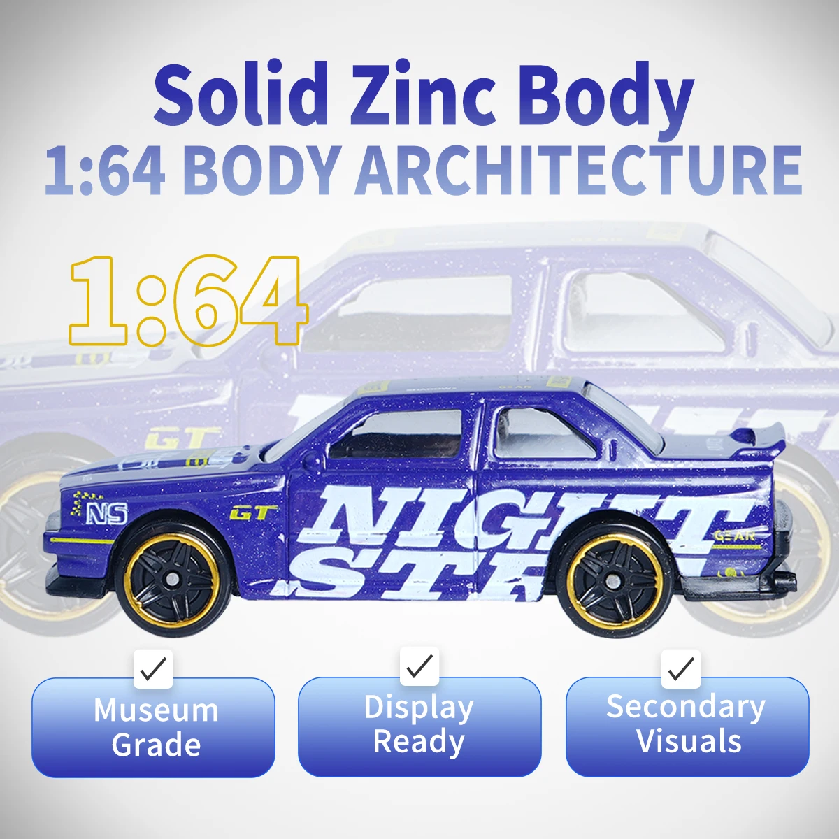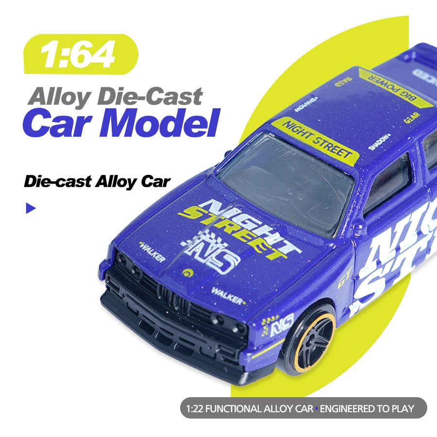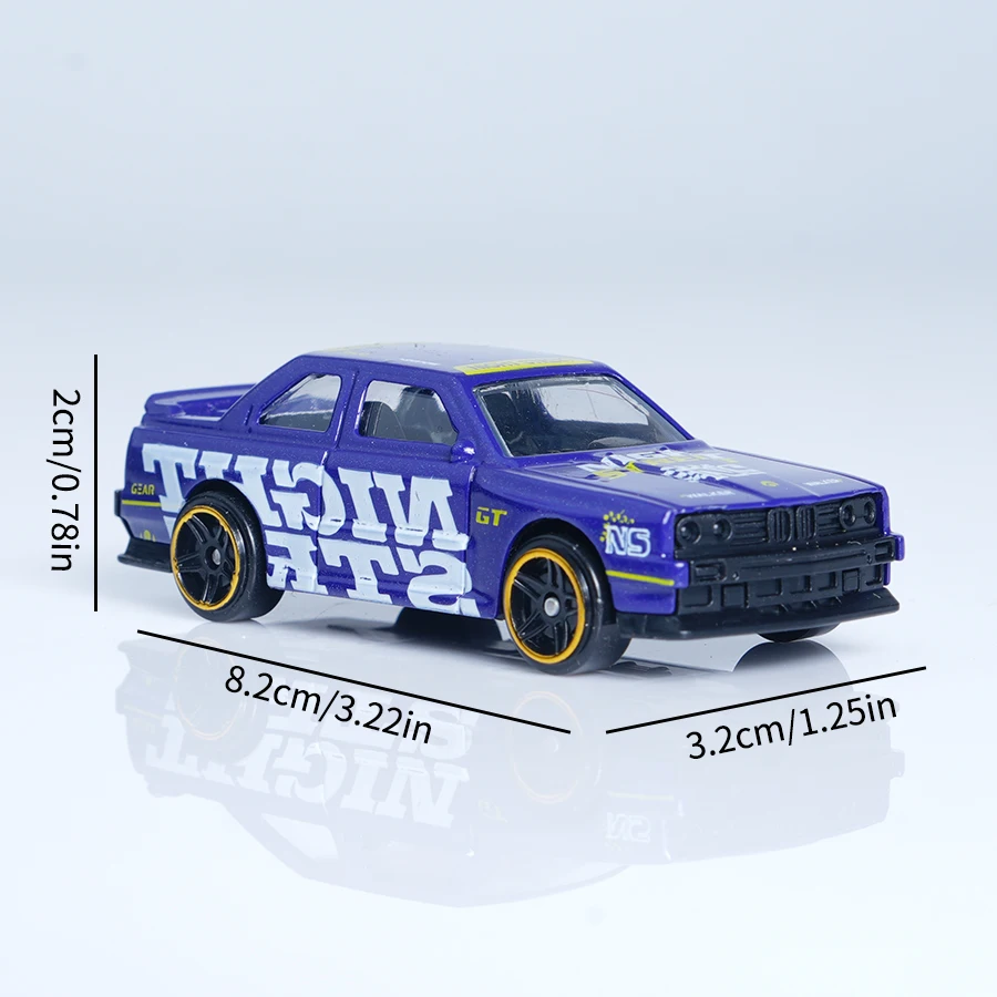 Experience the thrill of owning this highly detailed 1:64 scale alloy sports car, masterfully crafted from metal to showcase a sleek, aerodynamic silhouette. Its vivid purple finish is complemented by striking graphic decals, including prominent white text and smaller yellow accents that add energy and style. The model features sharp, angular lines with a streamlined roof and subtle hood indentations, emphasizing its high-performance appeal. The black multi-spoke rims with yellow-edged details and realistic tread tires enhance its sporty look. Transparent windows reveal a minimalistic interior, while small, angular side mirrors and vibrant rear graphics complete this energetic aesthetic. Perfect for display, play, or collection, this model exudes modernity and precision craftsmanship.