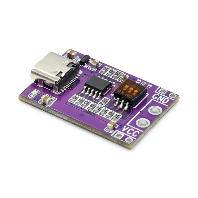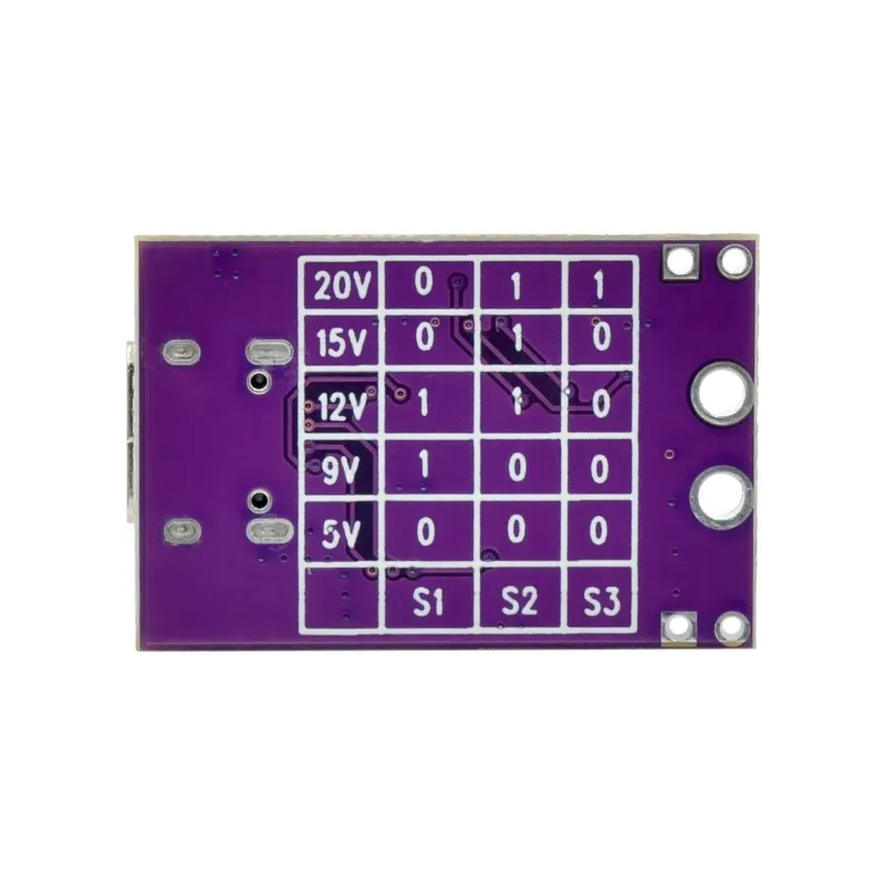 Enhance your fast charging setup with this versatile decoy trigger module featuring a vibrant purple PCB design. Supporting fixed voltage outputs at 5V, 9V, 12V, 15V, and 20V, it ensures reliable power delivery for compatible devices. The compact layout includes a sleek silver USB Type-C port, an orange semi-transparent multi-segment display for real-time status updates, and organized surface-mounted resistors and capacitors for optimal functionality. Crafted with precision, this new, customizable module is suitable for advanced power management applications, offering a modern aesthetic combined with dependable performance to meet your charging needs effectively.