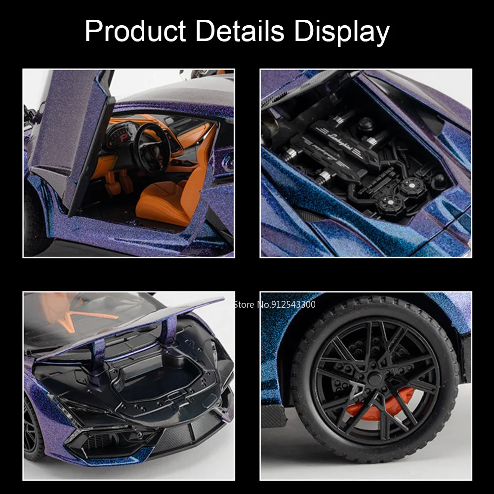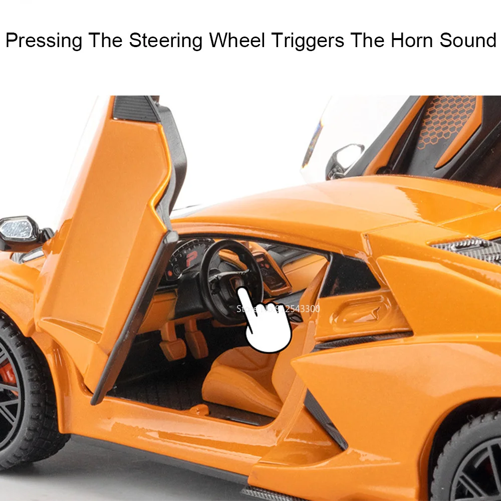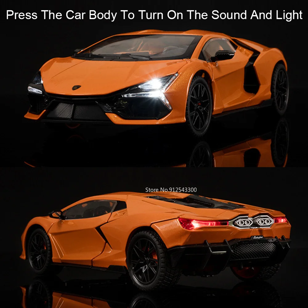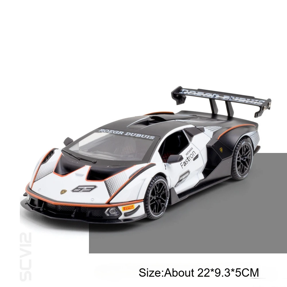 Experience the thrill of high-performance luxury with this detailed 1:24 scale diecast model car, available in vibrant colors including purple, orange, silver, green, white, and blue. Measuring approximately 21 cm for the Revuelto and 22 cm for the SCV12, it features a durable alloy body, plastic chassis, and rubber tires for realism and durability. Equipped with sound and light effects, pull-back motion, and functional opening doors, this high-simulation model captures the sleek, aerodynamic design with sharp lines and expert detailing. Suitable for collectors aged 14 and above, it operates on button batteries, offering a captivating display of automotive craftsmanship.