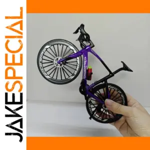 Imagine owning this highly detailed miniature bike, perfectly capturing the essence of a real mountain bike in a compact 20.5 cm length. Crafted from durable diecast metal, this model boasts a vivid metallic purple frame that commands attention. The realistic tubular structure reinforced with crisp white “RACING” and “SPECIAL” decals accentuates its sporty design. Its black wheels feature intricate thin spokes that mimic real rims, adding to the authenticity. The handlebar, equipped with textured grips and brake levers, enhances the realism, while the slim black seat complements the overall sleek appearance. A small red water bottle with a green cap mounted on the down tube adds a lively splash of color and extra detail. This collectible is a true tribute to mountain biking aesthetics, perfect for display or collection, and guaranteed to impress enthusiasts.