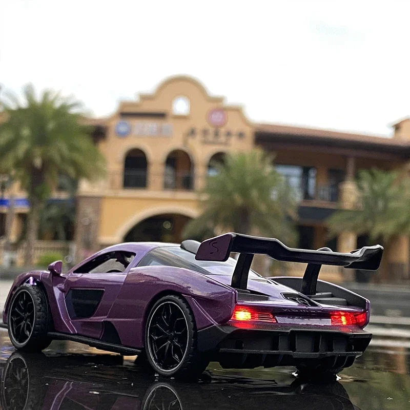 Experience the thrill of owning this highly detailed 1:32 scale diecast Senna sports car model. Crafted from alloy and plastic, it captures the sleek, aerodynamic contours of the real vehicle with precision. The vibrant purple finish features a glossy surface that highlights its modern, high-performance design. With sharp angular lines, sculpted contours, and an iconic rear wing, this model exudes speed and sophistication. The movable gullwing-style doors reveal an intricate cockpit interior, while the black multi-spoke alloy wheels and low-profile tires add realism. Integrated sound and light effects subtly enhance the experience, making this model a perfect collectible. Its reflective finish and expert detailing make it a standout piece for enthusiasts and collectors alike.