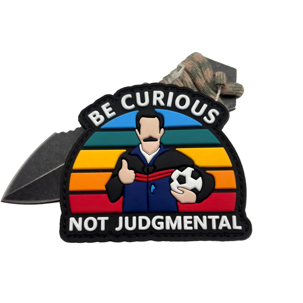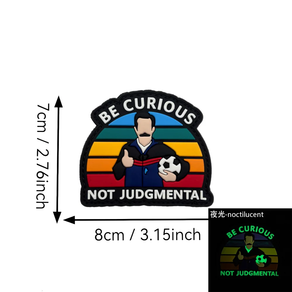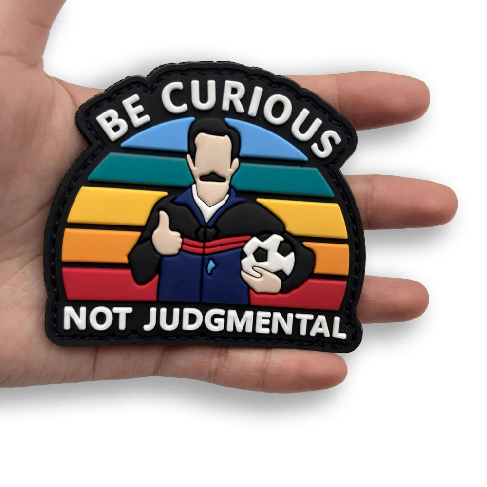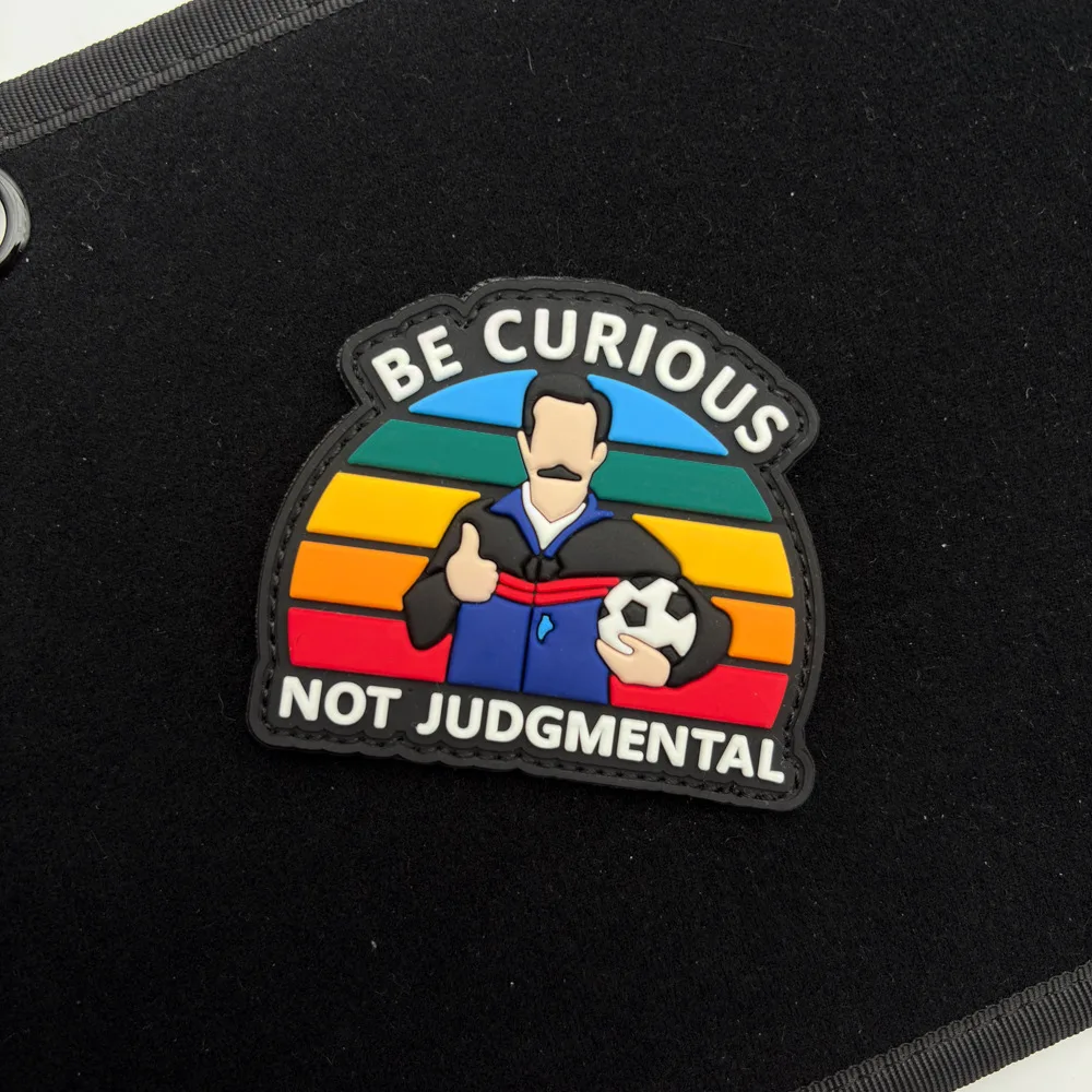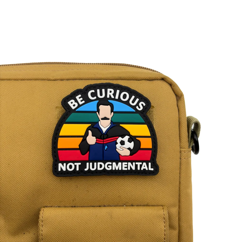 Experience the playful charm of this vibrant PVC soft rubber referee patch, perfect for customizing your apparel and accessories. Its colorful background features lively rainbow stripes in blue, green, yellow, orange, and red, creating an eye-catching backdrop. The embroidered 3D design depicts a cartoon-style male referee holding a soccer ball, with a confident expression, simplified facial features, and stylish black hair and mustache. Bold white lettering above and below the figure reads “BE CURIOUS” and “NOT JUDGMENTAL,” sending a positive message. Encased in a sleek black border, this patch adds a modern, cheerful touch to jackets, backpacks, hats, or DIY projects. Its durable stitching and eco-friendly materials ensure long-lasting quality and vibrant visual appeal for any energetic look.