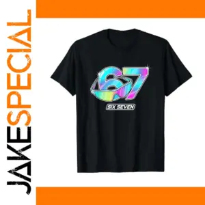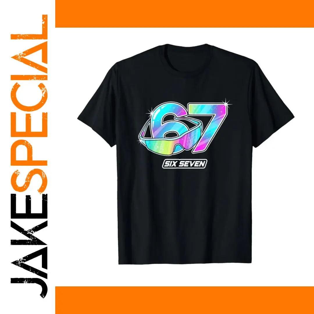 Experience the vibrant, playful style of this unisex black T-shirt made from 100% cotton, perfect for all seasons. Its eye-catching graphic features the number “67” in large, holographic rainbow-like shades of blue, pink, purple, yellow, and green, with glossy, reflective surfaces and star-like sparkles that add energy and flair. The smaller rectangular label with white uppercase text on a black background enhances its modern appeal. Designed for casual wear, it features short sleeves (4-16″), a pull-on closure, lightweight, breathable material, and is machine washable. Available in sizes S to 5XL, this T-shirt combines comfort with a youthful, energetic aesthetic that truly stands out.