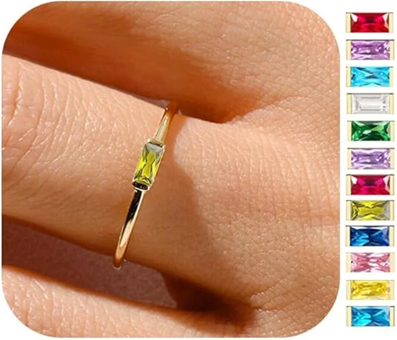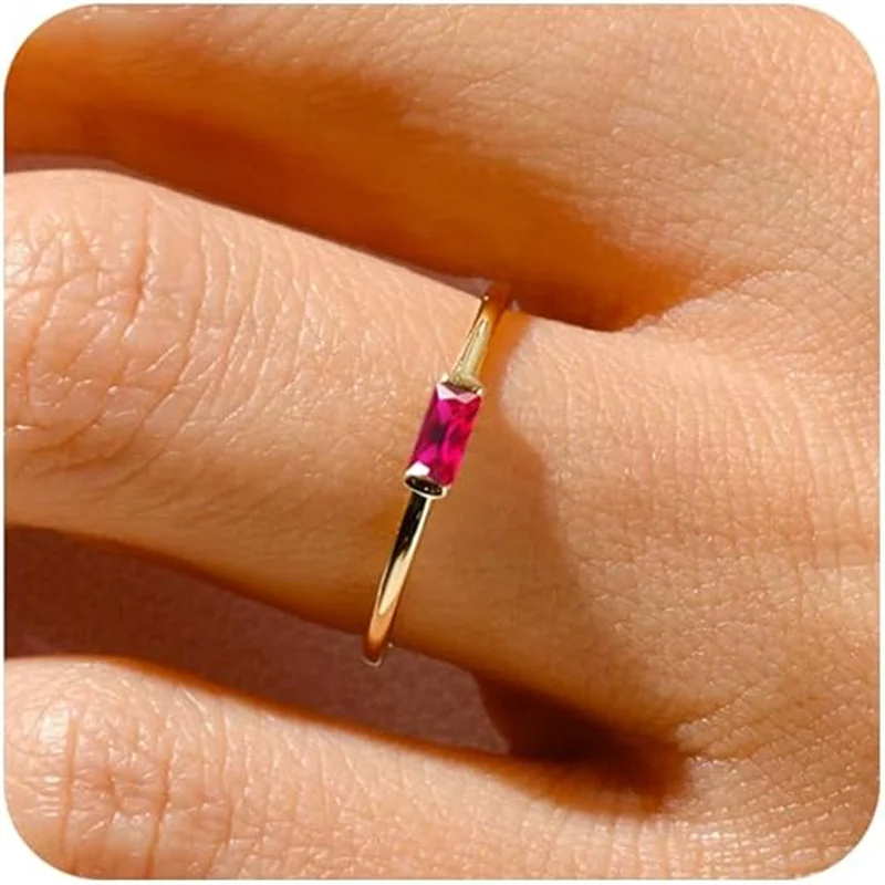 Discover a stunning addition to your jewelry collection with this contemporary women's ring featuring a sleek, minimalist band crafted from copper with a gold-tone finish. The design emphasizes elegance and simplicity, with a slender, smooth, and polished band that ensures comfortable wear for everyday or special occasions. At the center, a vibrant rectangular artificial gemstone—available in colors such as garnet, amethyst, aquamarine, diamond, emerald, alexandrite, ruby, olive green, sapphire, pink, citrine, or topaz—adds a pop of brilliant color. The gemstone's faceted surface subtly shimmers, enhancing the ring's modern geometric appeal. The clear bezel setting perfectly frames the stone, highlighting its striking hue while maintaining a trendy, fashionable aesthetic. This versatile piece seamlessly combines style and personalized symbolism, ideal for celebrating milestones like anniversaries or birthdays, making it a meaningful gift or personal statement.