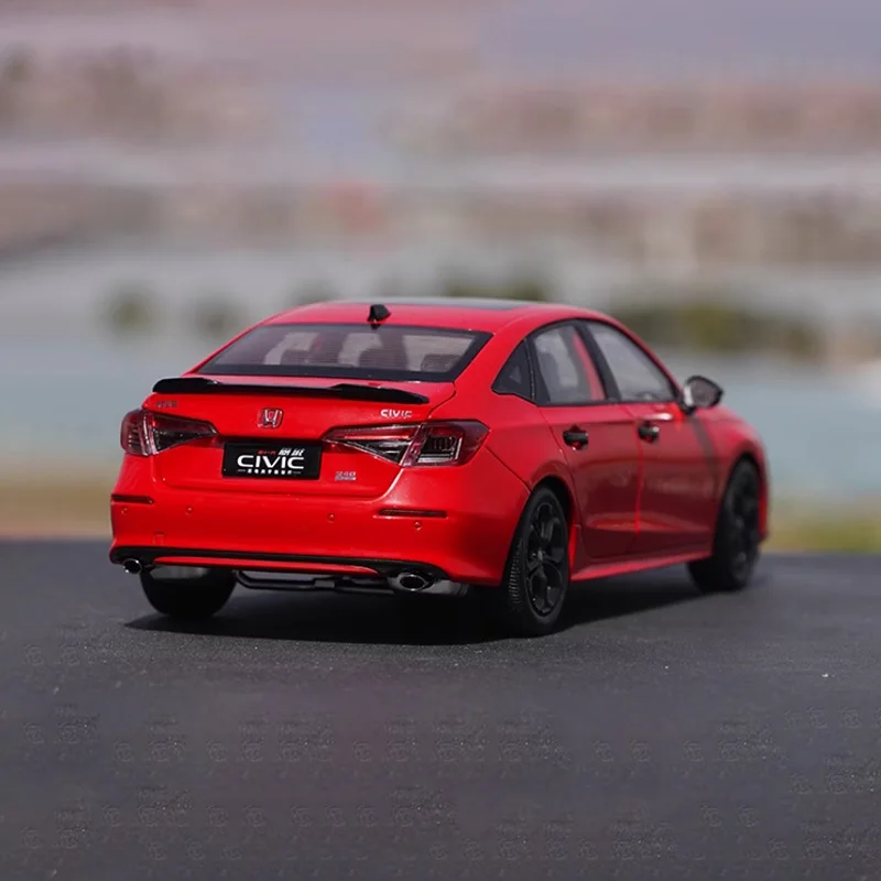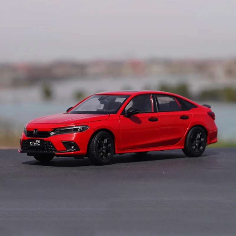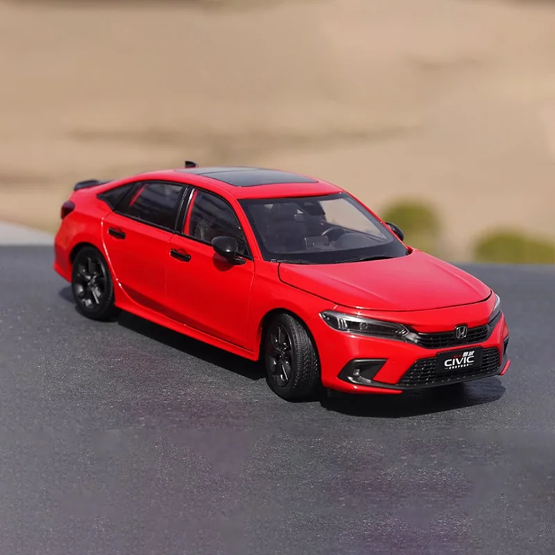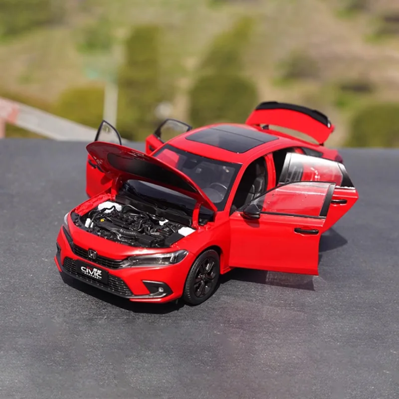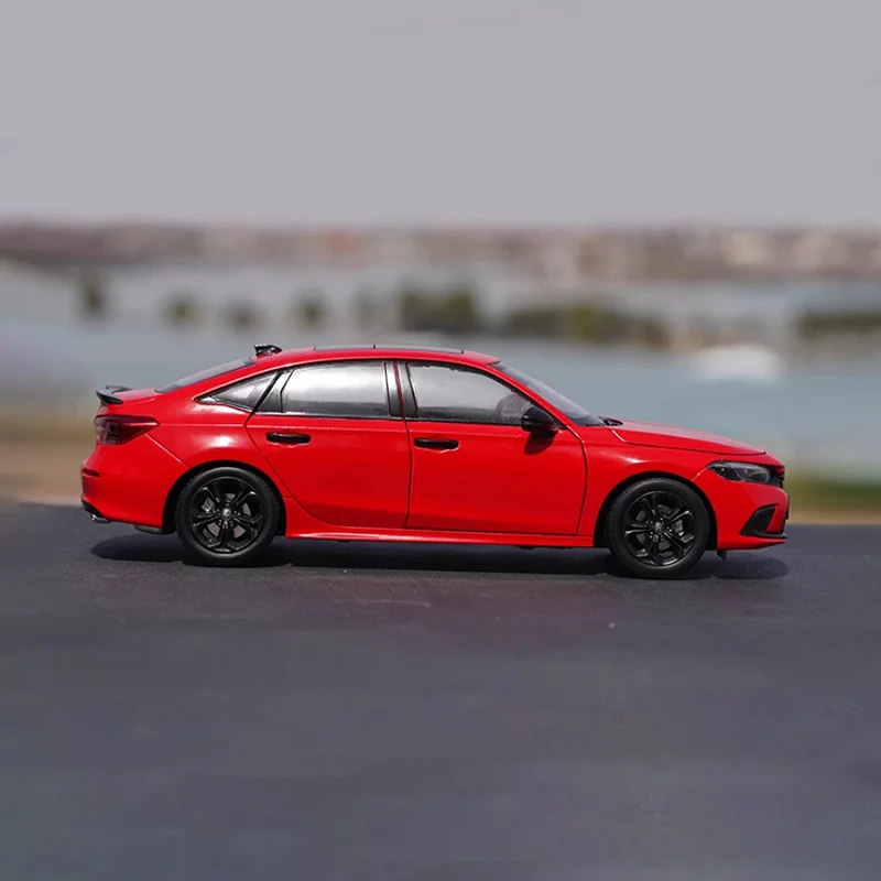 Discover the stunning realism of this highly detailed, vibrant red diecast Honda Civic 2022 Generation Eleven model. Measuring approximately 22 cm long, 10 cm wide, and 9 cm tall, this 1:18 scale alloy replica captures the sleek, aerodynamic contours of the original vehicle. Its glossy finish enhances the bold and energetic look, while subtle creases on the hood and sharp, narrow headlights add a modern, aggressive touch. Black accents on the side mirrors and multi-spoke rims create striking contrast that highlights its sporty design. With transparent windows revealing interior details, this static collectible is perfect for display and admiration, allowing you to appreciate craftsmanship and style in every angle. An ideal addition to any collection or display setup.