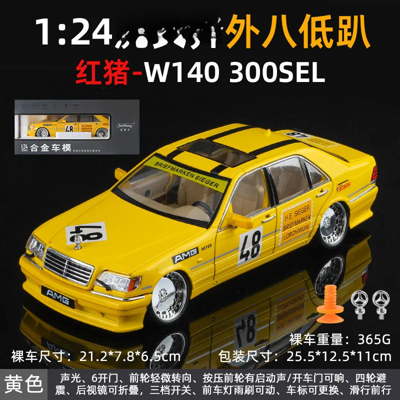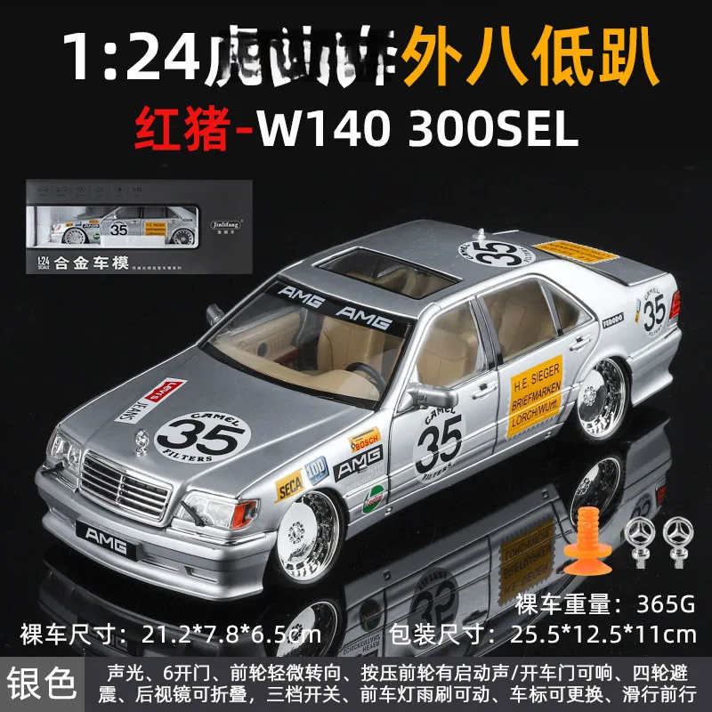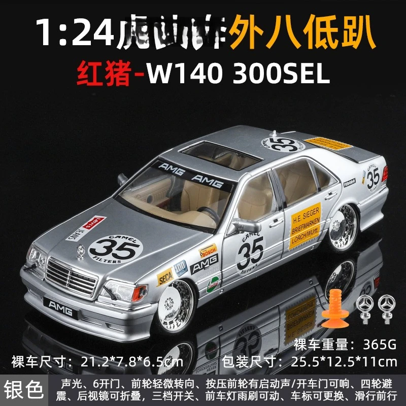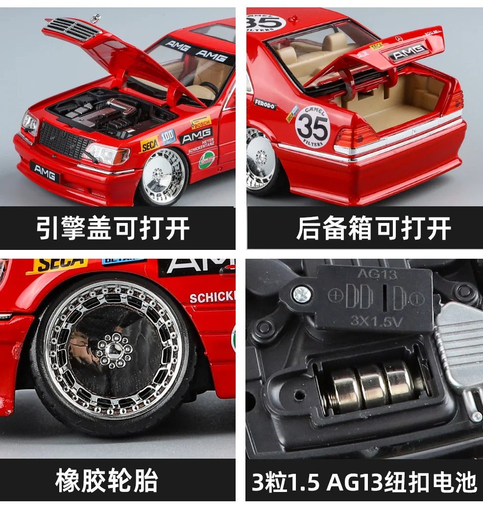 Experience the thrill of owning this meticulously crafted, modified Mercedes-Benz W140 320SEL-inspired sports car model. With a stunning, glossy red finish that reflects light beautifully, this 1:24 scale diecast alloy car captures dynamic racing decals and sponsor stickers, bringing a sense of speed and excitement. The large white circles with the number 35 and bold “AMG” banner enhance its sporty appeal. Realistic details such as multi-spoke silver wheels, black treaded tires, transparent sunroof, headlights, taillights, and side mirrors contribute to its lifelike appearance. Its low, aerodynamic stance and shiny surface make it an eye-catching addition to any collection or display, ideal for passionate enthusiasts and collectors alike. This model combines style, function, and craftsmanship.