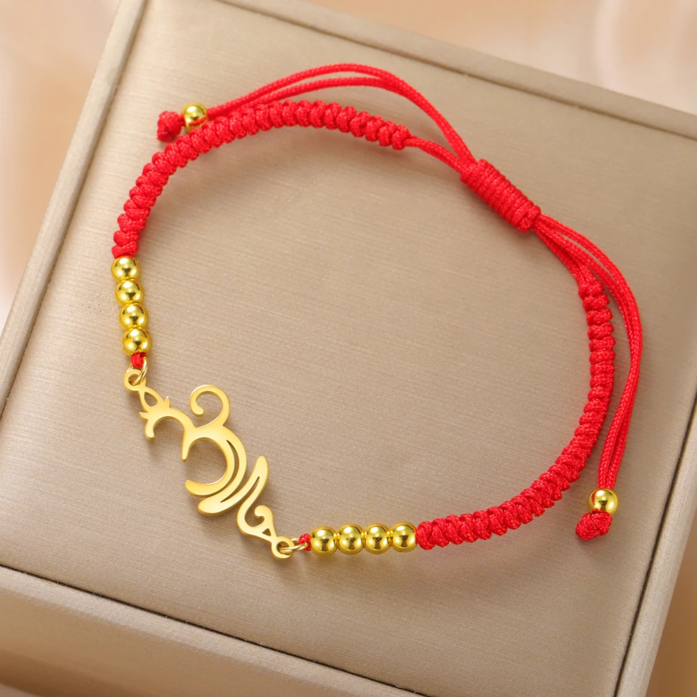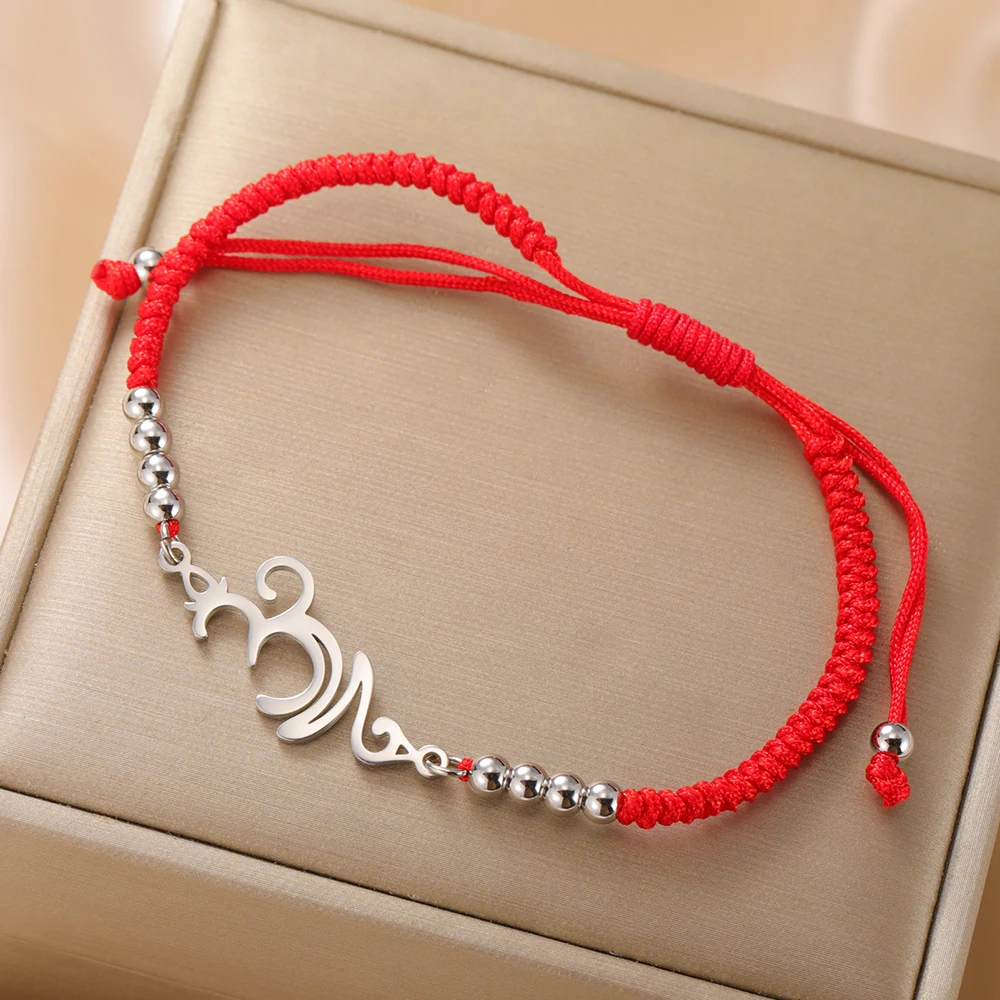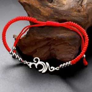 - The vibrant woven red cord and metallic beads create a striking visual contrast, combining traditional symbolism with a contemporary, fashionable aesthetic suitable for both genders.