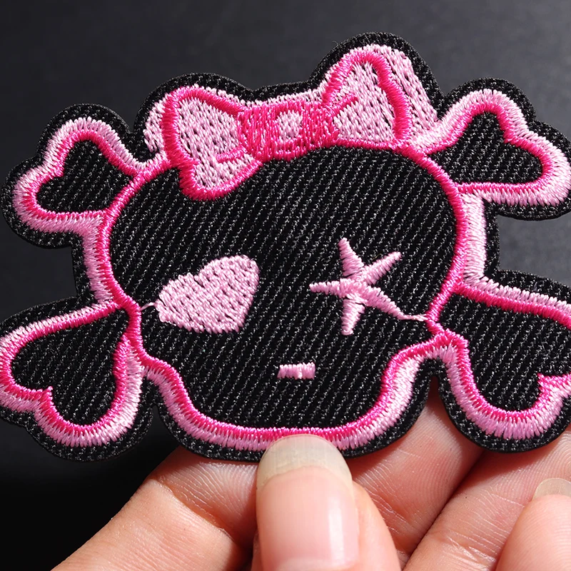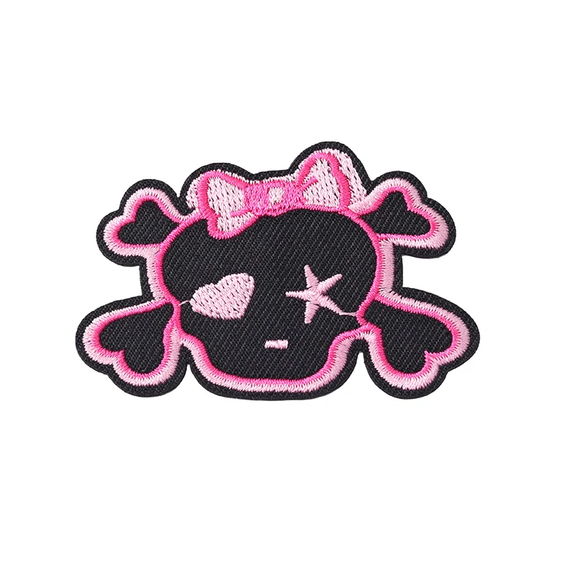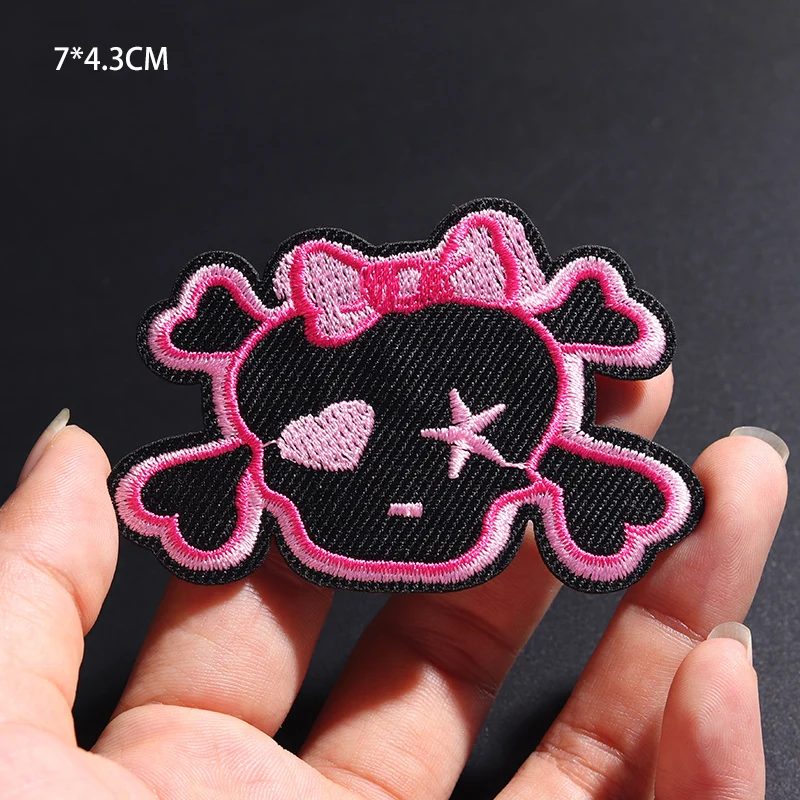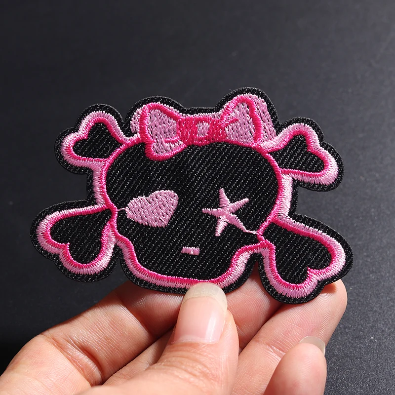 The RED SKULL embroidered patch showcases a bold design that effortlessly turns any outfit into a statement piece. Measuring 4.3 cm in height and 7 cm in width, this patch features a vivid red skull outlined in bright pink thread, complete with a playful expression, a charming pink bow, and whimsical elements like a heart and stylized star. Constructed from durable non-woven fabric, it boasts neatly finished edges for long-lasting wear. You can easily apply it to your favorite clothing or accessories using either a sewing method or the convenient iron-on application, allowing you to express your personal style with ease.
