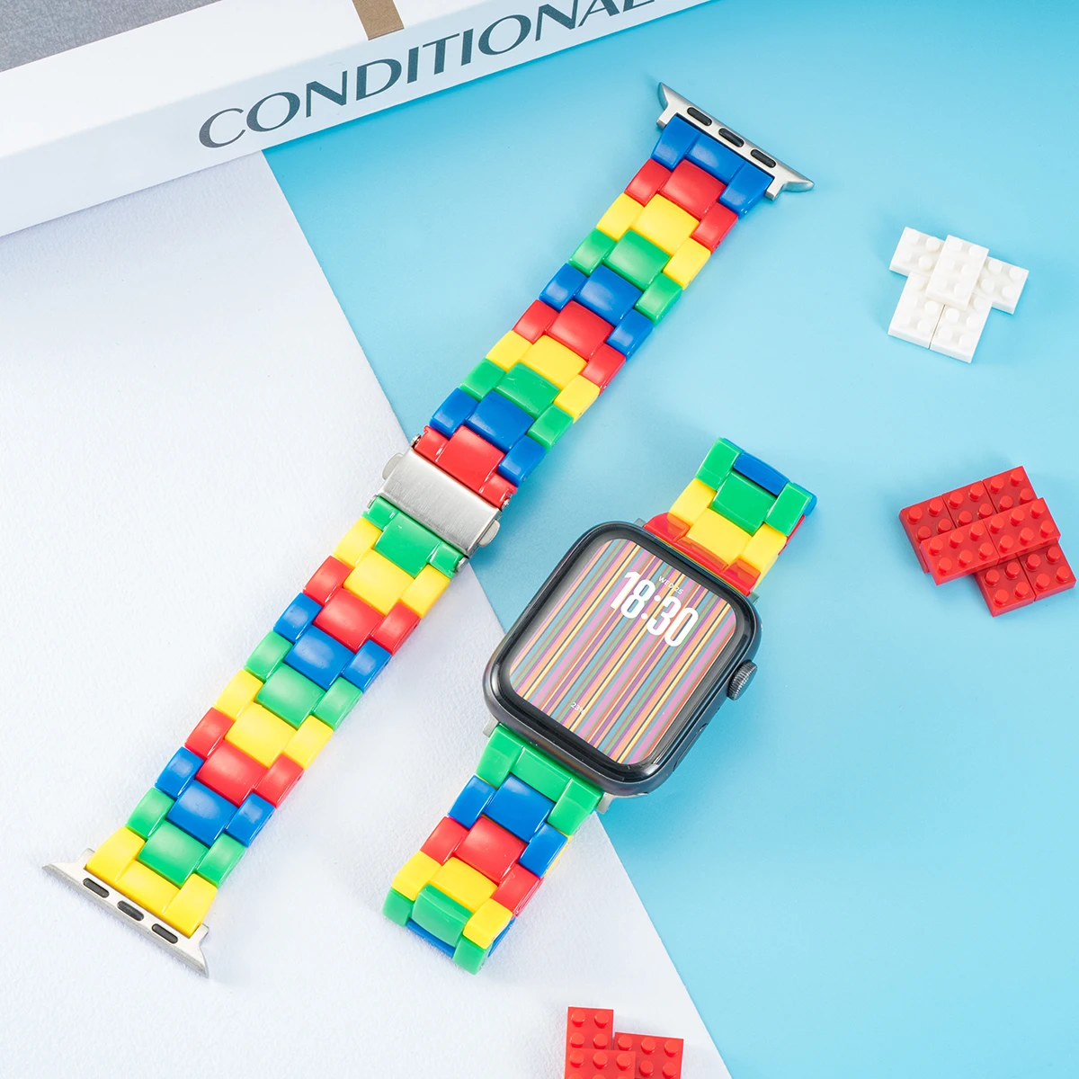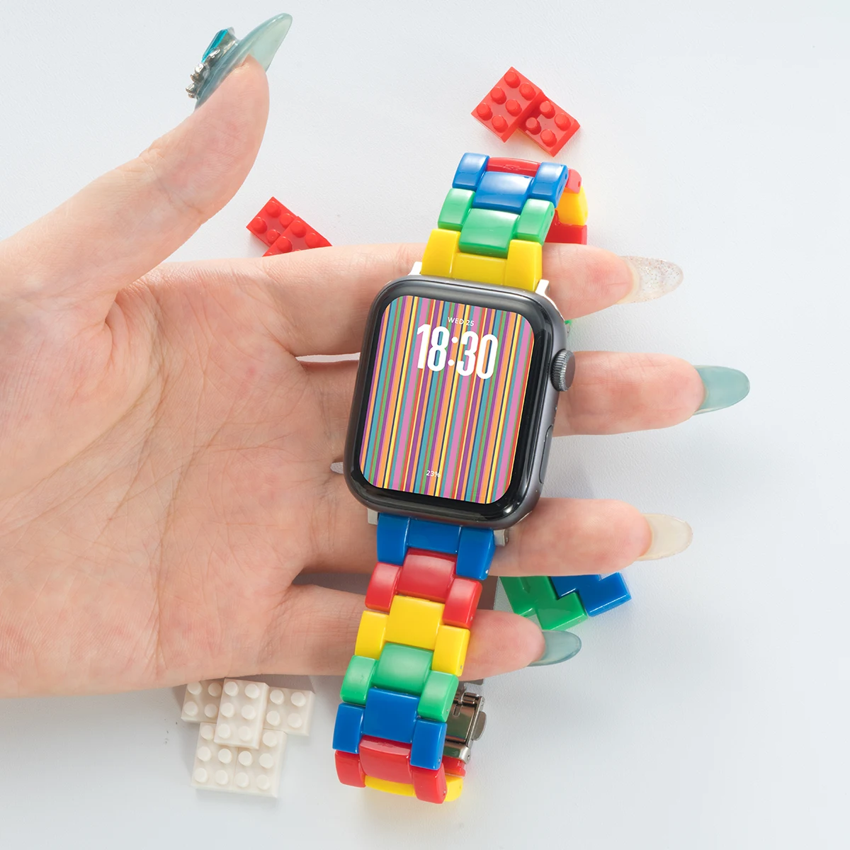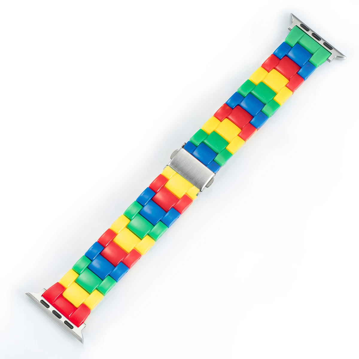Enhance your Apple Watch with this vibrant resin band, available in two playful color styles designed to match your personal style. Crafted from durable resin, the strap features interlocking rectangular links in bright primary colors—red, yellow, green, and blue—creating a fun rainbow effect with a glossy, polished finish. Compatible with a wide range of models including Apple Watch Ultra 2, 1, 9, 8, 7, 6, 5, 4, 3, 2, 1 series, and iWatch from 38mm to 49mm, with band widths of 38-42mm and 42-46mm. The smooth, rounded edges offer comfort, making this Korean-style bracelet a bold, youthful addition to your smartwatch.