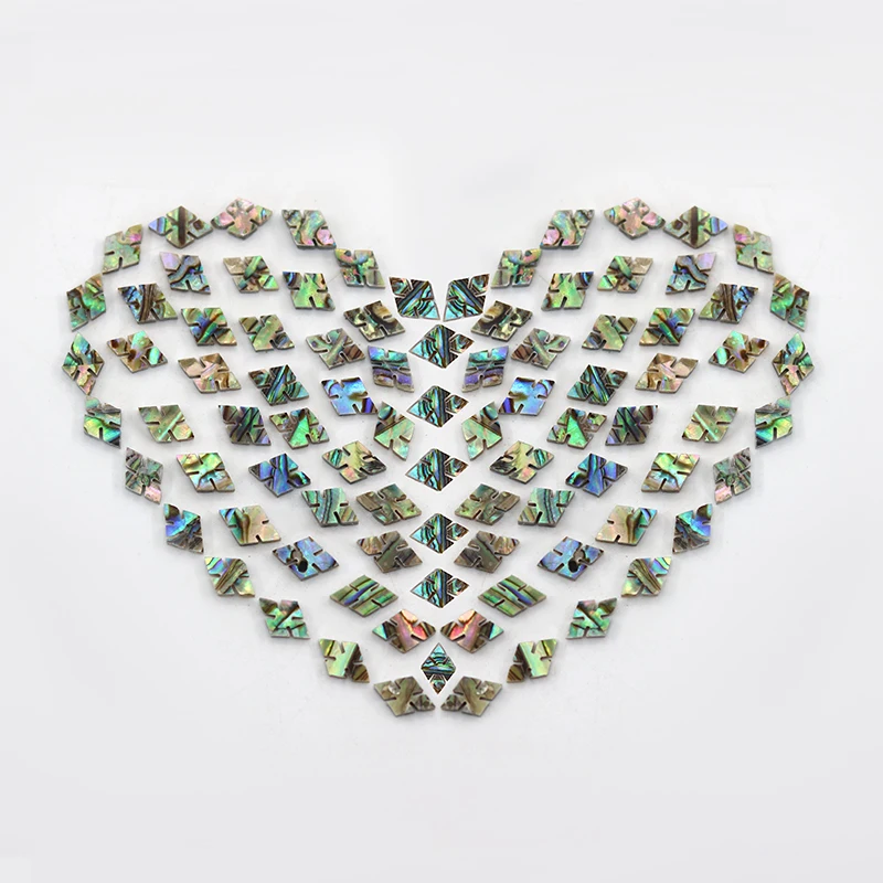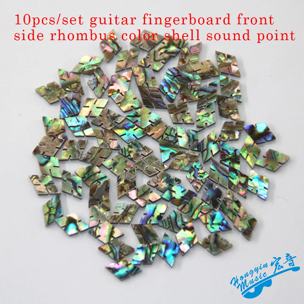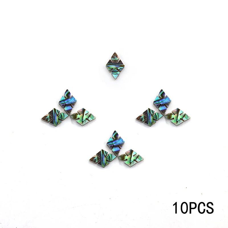 - Set of 10 rhombus-shaped guitar tone points crafted from colorful shell and abalone shell for vibrant, iridescent appeal.