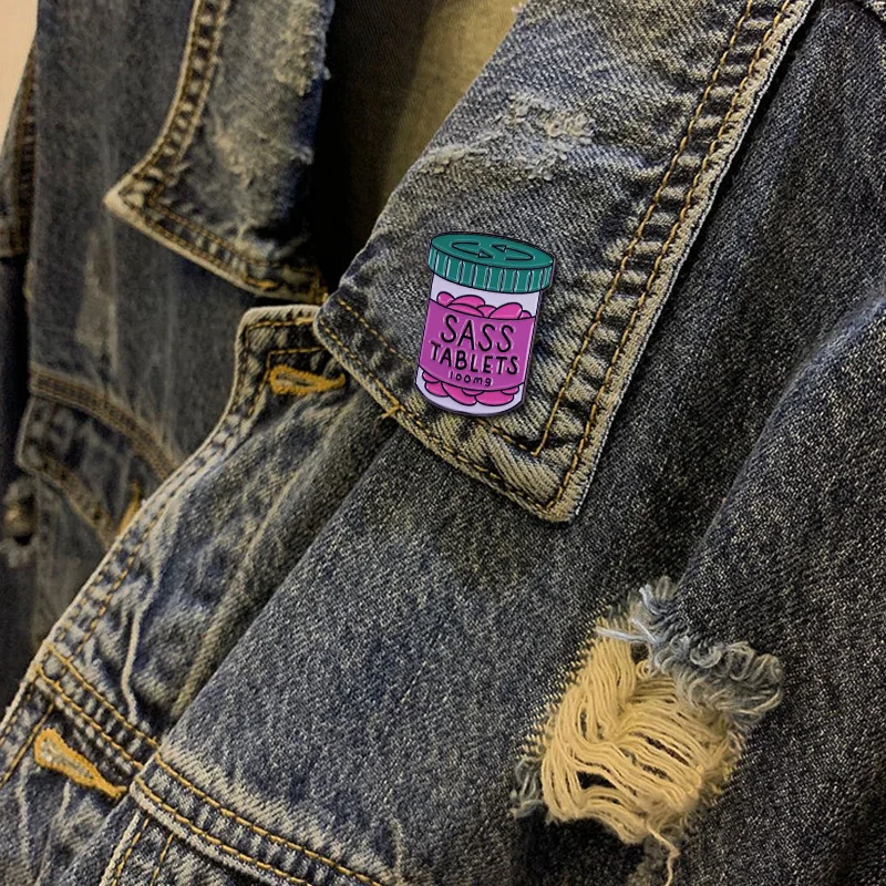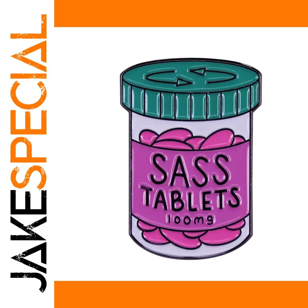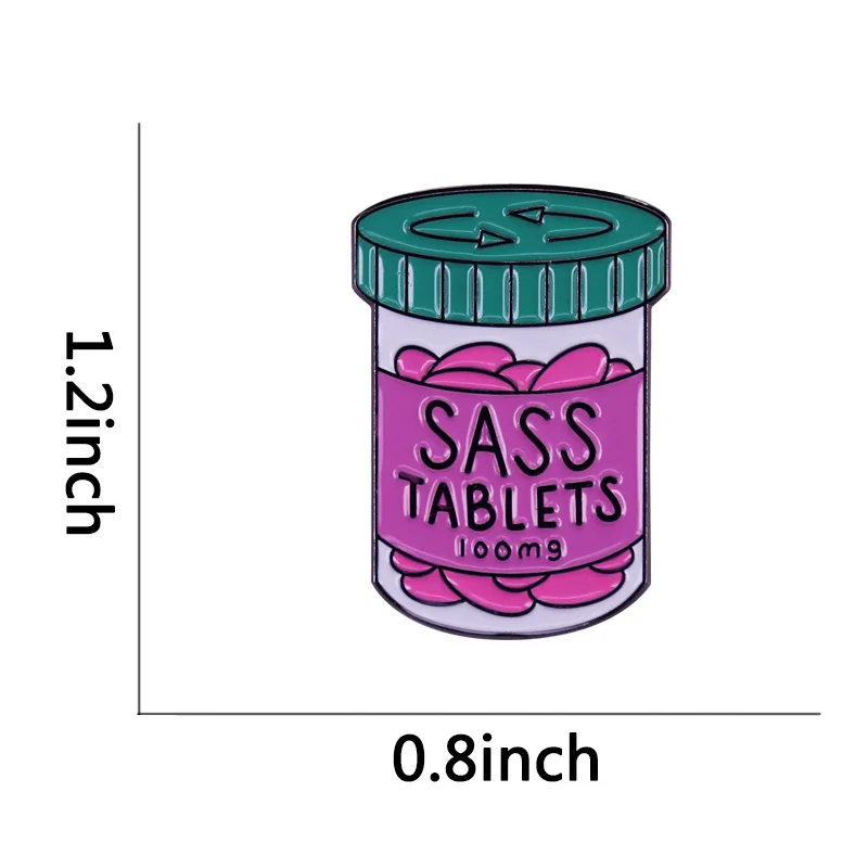 Add a bold, playful touch to your accessories with this colorful enamel pin designed to resemble a trendy container of “SASS TABLETS.” Crafted from copper, this about 30 mm pin features a glossy, smooth finish that catches the eye. Its cartoonish style includes a teal screw-top lid with engraved arrows, indicating a twist-open mechanism, and a lavender-colored body wrapped with a wide pinkish-purple label displaying “SASS” and “TABLETS” boldly in black. Inside, stylized pink tablets are visible, emphasizing a vibrant, confident attitude. The modern design exudes sass and empowerment, perfect for anyone who wants to express their strong personality or feminist message. Wear it on clothing, bags, or accessories to showcase your confident style daily.